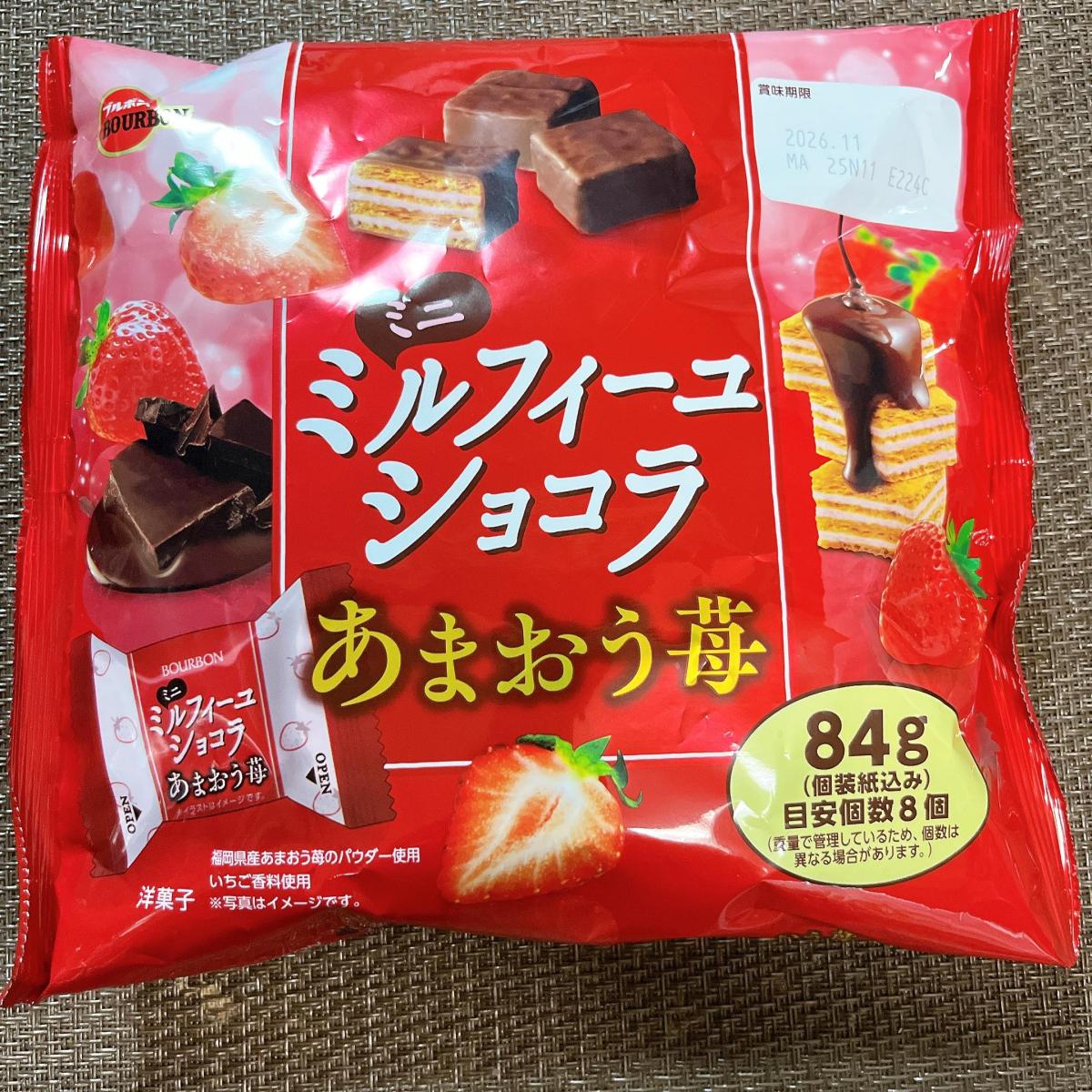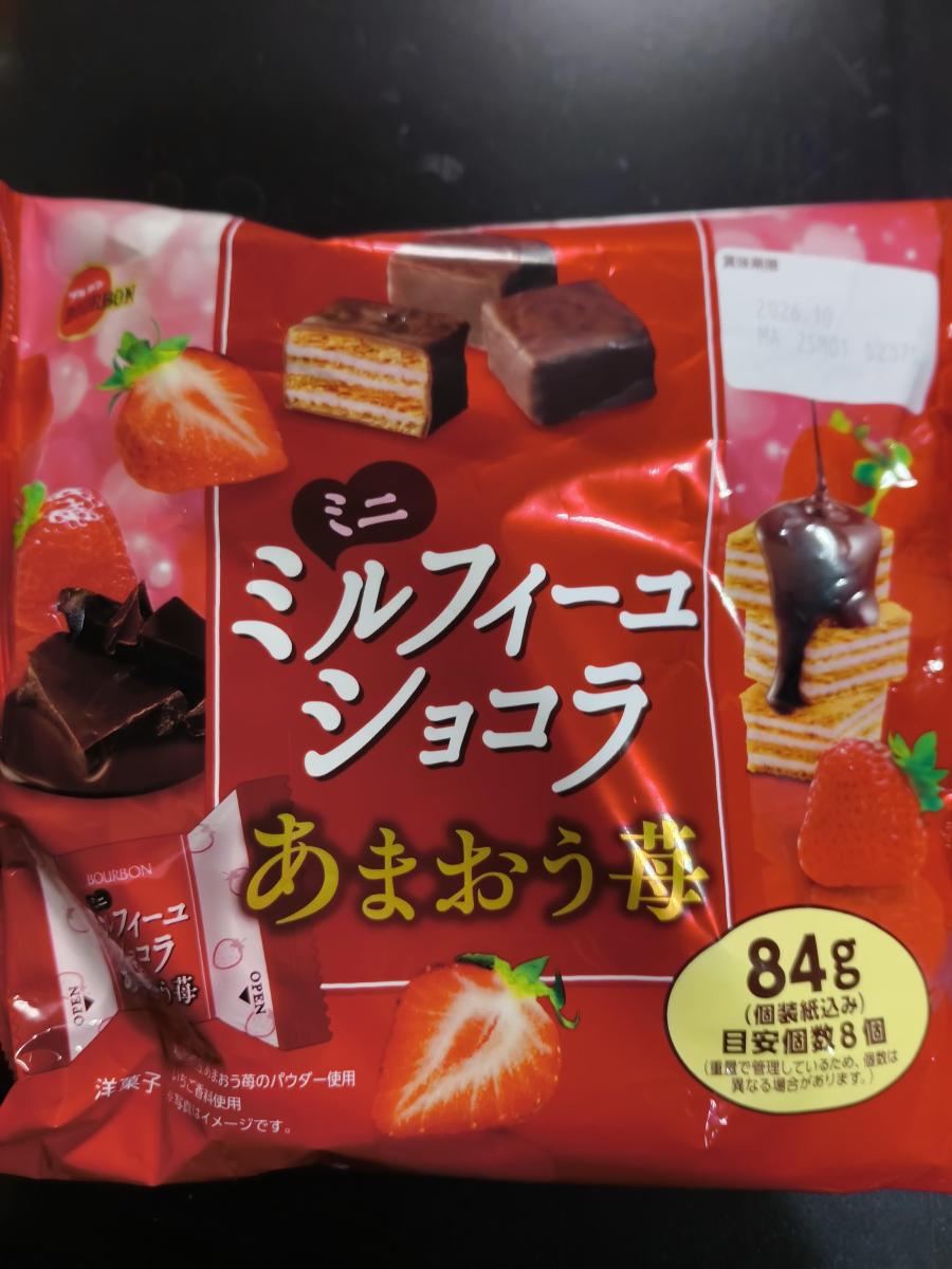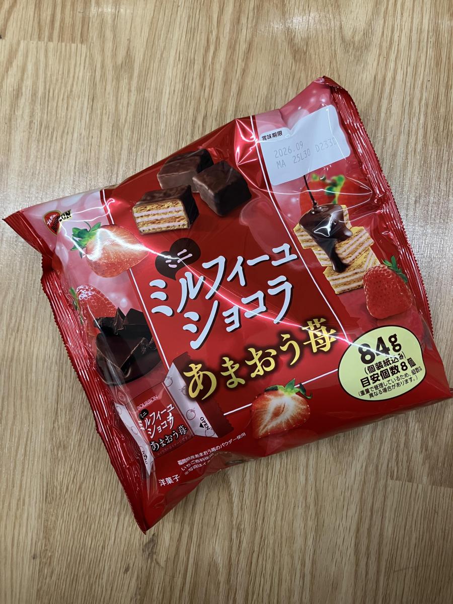 ブルボンのミルフィーユショコラあまおう苺味は、サクサクのパイとやさしい苺チョコの甘酸っぱさが好相性です。あまおうの華やかな香りが広がり、軽い口当たりでつい手が伸びるおいしさです。
