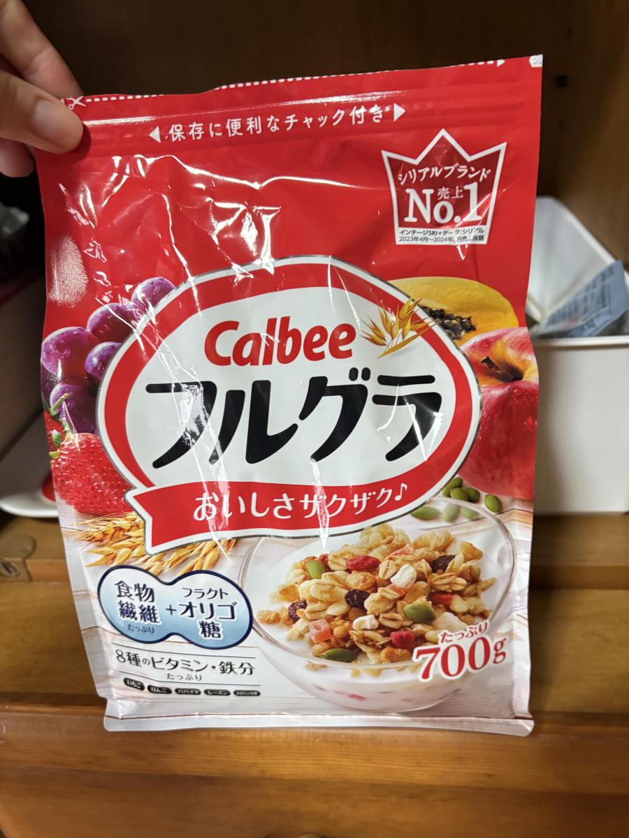 糖質を気にして白い袋の糖質オフのものも買ってみましたが味がもの足りなくて、やっぱりこの赤い袋のフルグラが一番好きだと思いました。