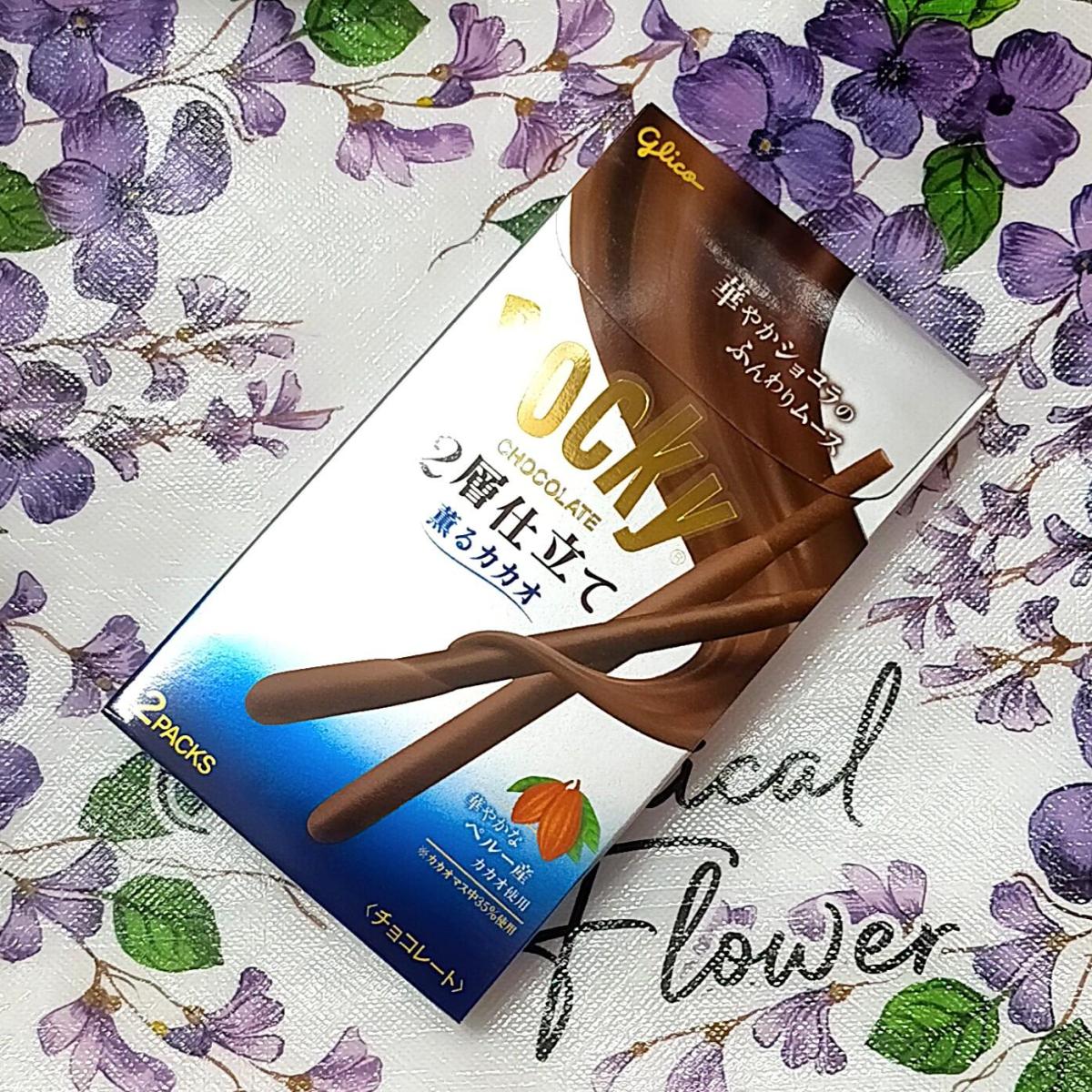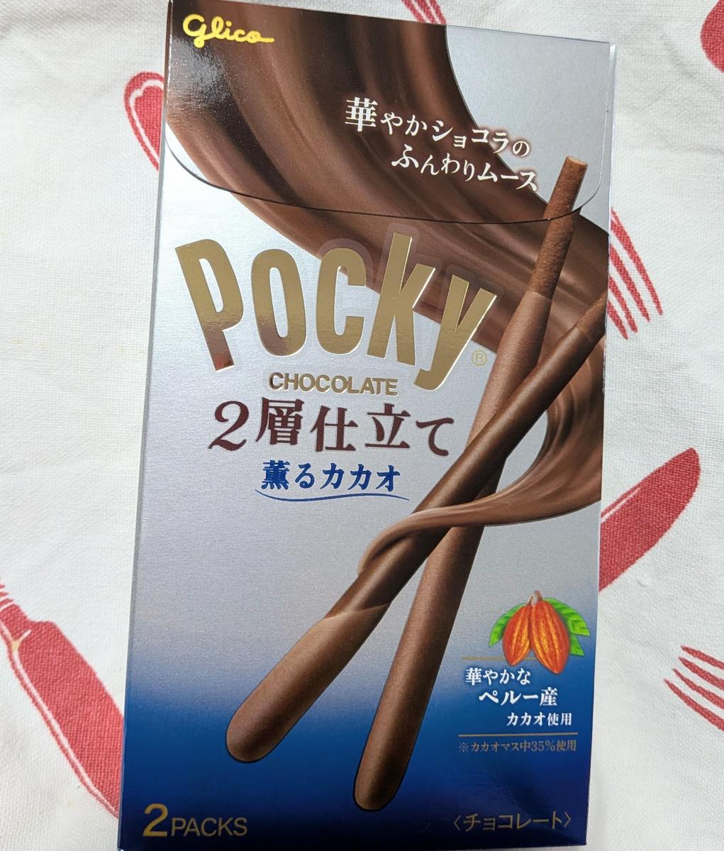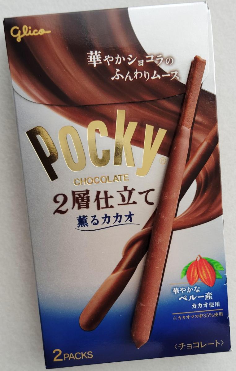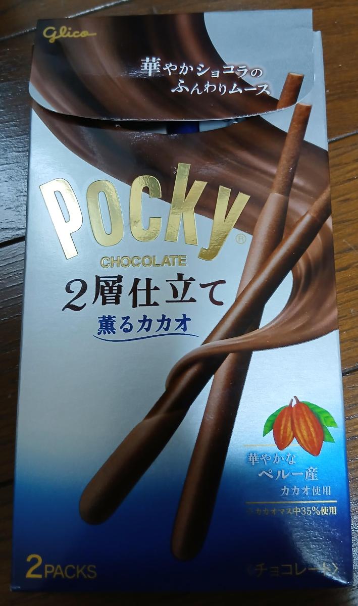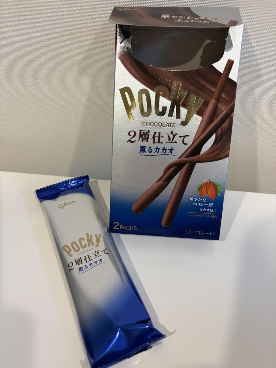 スッキリしたデザインのポッキーは、2層仕立て薫るカカオだそうです。ペルー産のカカオを使用しているとのことです。