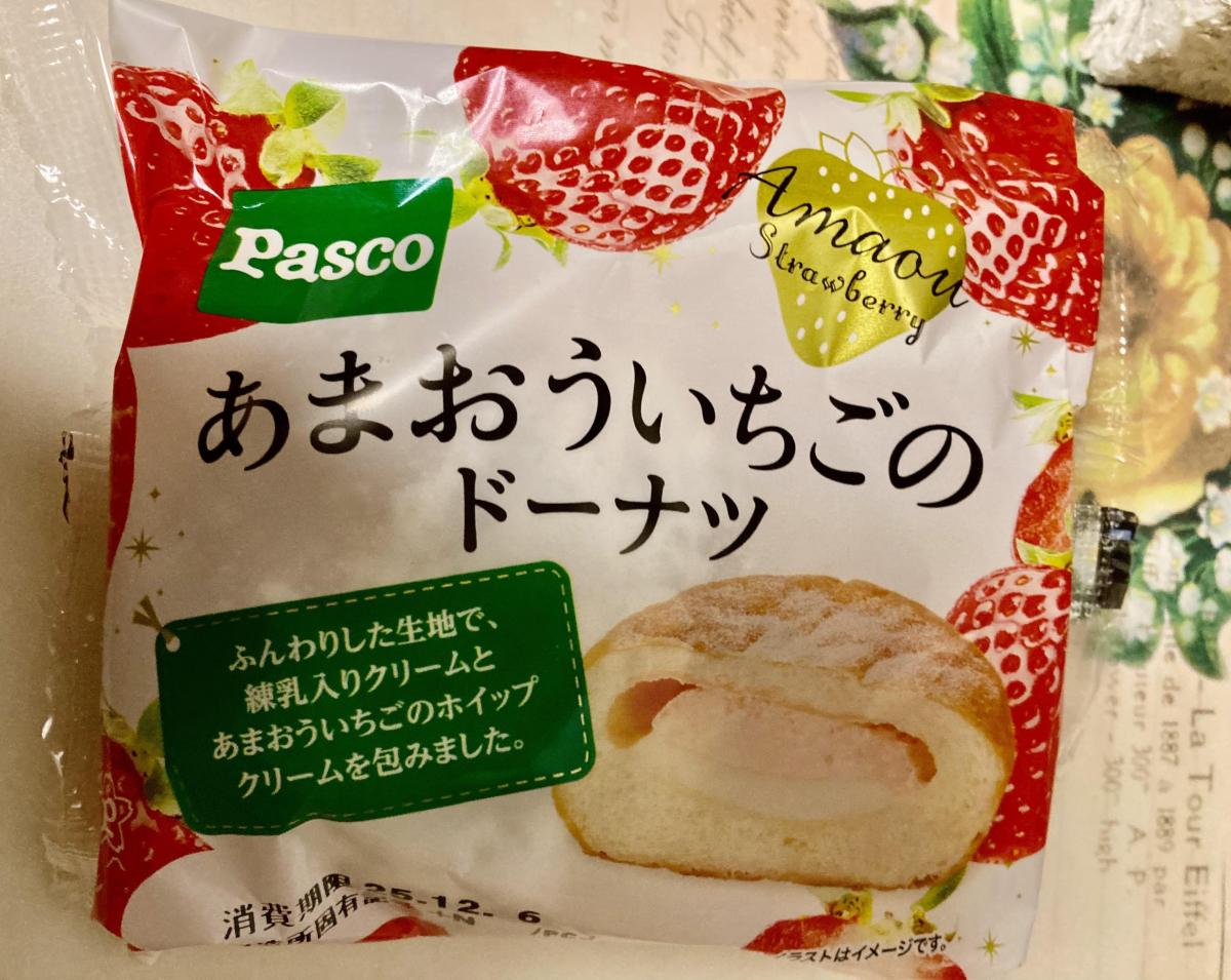 Pasco あまおういちごのドーナツのネーミングとパッケージの色合いに目が惹きどんな味か試したく購入してみました。上部には粉砂糖がたっぷりかかっており、表面はしっかり油感があり内生地はふんわり柔らかい食感です。いちごホイップはなめらかで、ミルキーないちご風味で、酸味はあまり感じられなかったです。練乳クリームは、ねっとりしっかり甘めのミルキーなクリームで、全体的に甘さたっぷりでした。コスパも良いです。