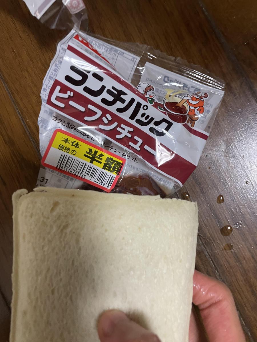外出先でお昼ごはんに食べました。流石にお肉がゴロゴロとはおもいませんでしたが、ビーフシチューのルーだけが冷めて固まった感じの口当たりです。お野菜でも食感のあるものが入っていると良いなと思います。トースターでこんがりとトーストするか、電子レンジで軽く温めると、もう少し口当たりも良くなるかもしれません。