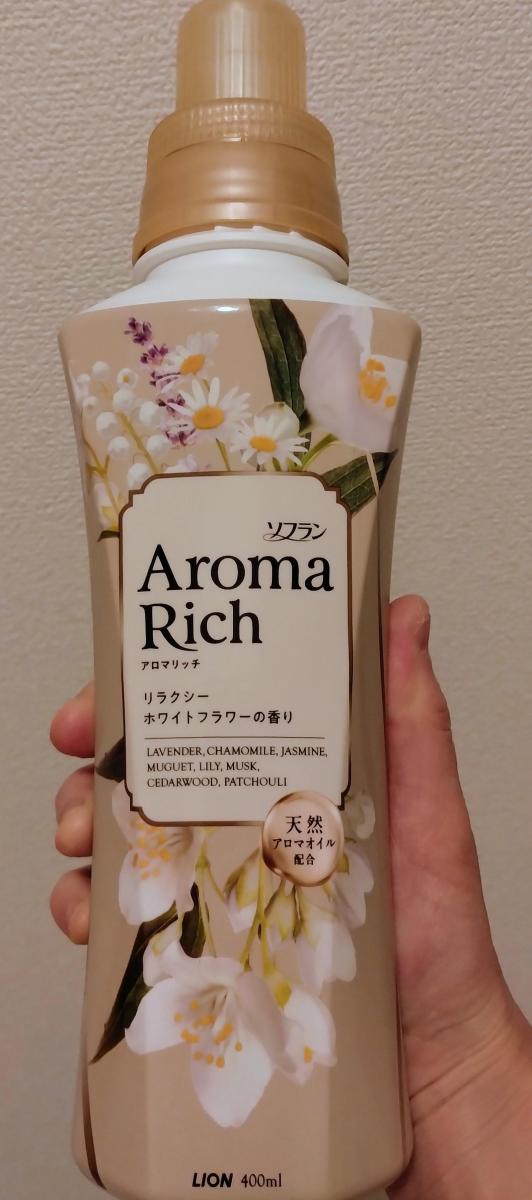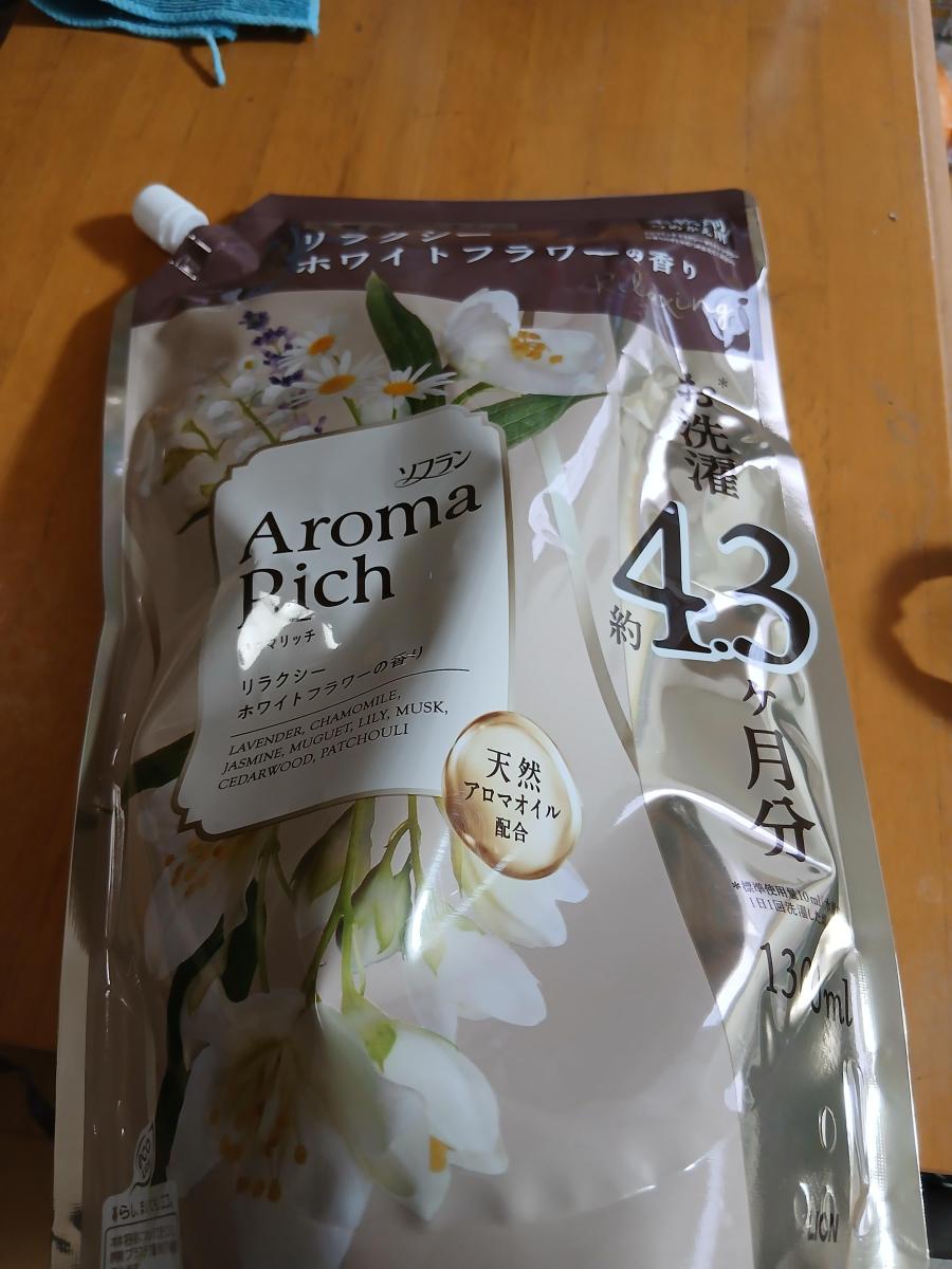 ソフランアロマリッチ、リラクシーホワイトフラワーの香りです。ジャスミンやカモミールなどの香り、天然アロマオイル配合とありました。パッケージに香りの強さは強めの表示になっており、規定量の半分以下の使用でも、部屋干しなどすると割と香りが充満します。爽やかというより、上品な花の香り、ムスク系?の香水にあるような香りかと感じました。好みの分かれそうな香りで個人的には少しキツいと感じてしまいました。タオルなどはふんわり仕上がります。