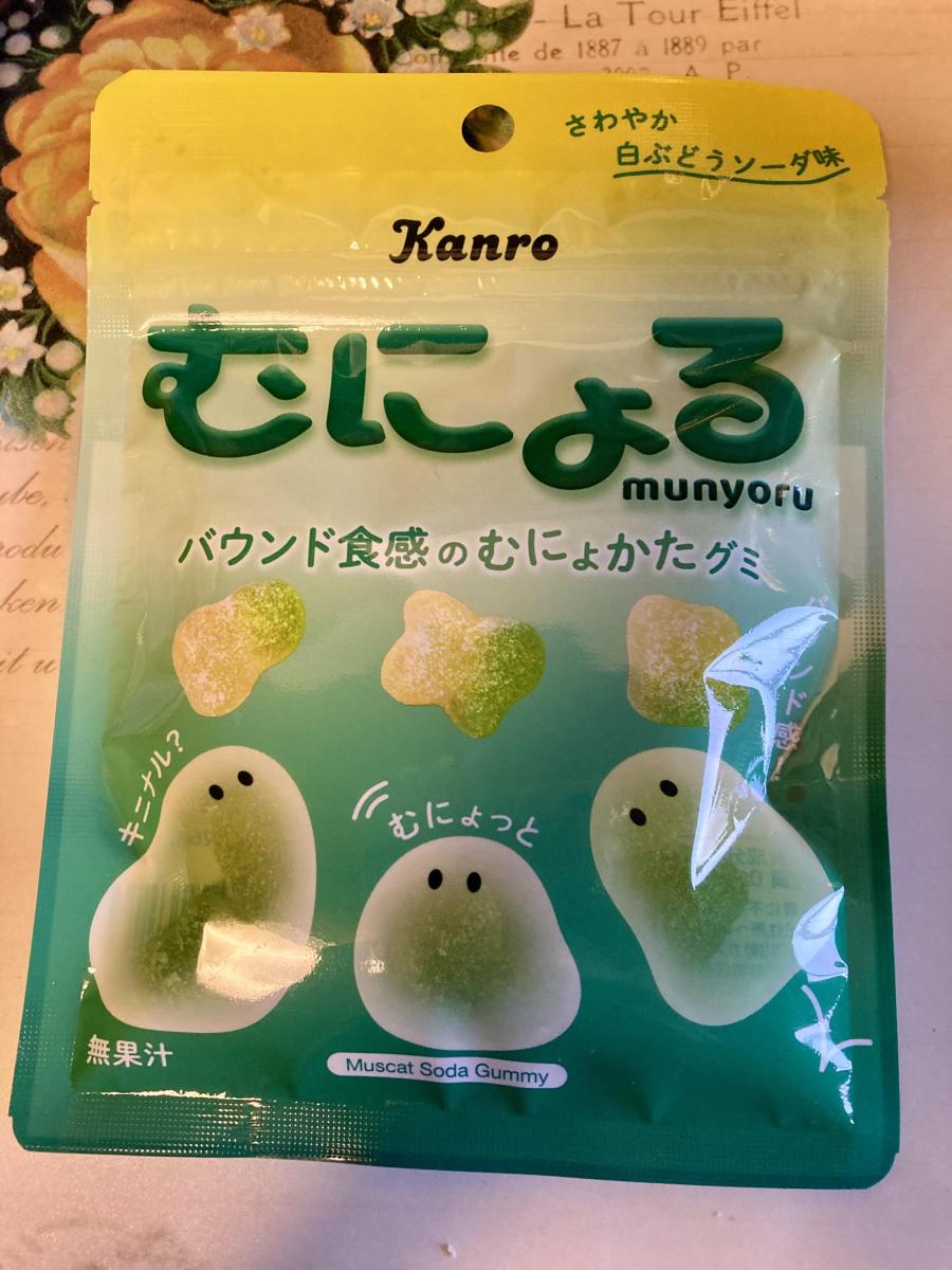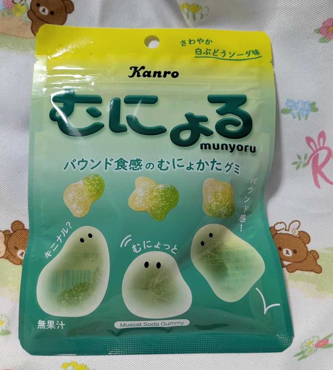 むにょるグミ白ぶどうソーダ味のネーミングに惹かれてどんな味か試したく購入してみました。パッケージの絵もかわいいです。食べてみるとむにゅむにゅっとしっかりと噛み応えあるややハードとソフトの中間ぐらいの食感でした。噛み応えがたっぷりなので、白ブドウの甘さと程よい酸味がしっかりと感じられました。ソーダーはやや弱めに感じましたが美味しかったです。