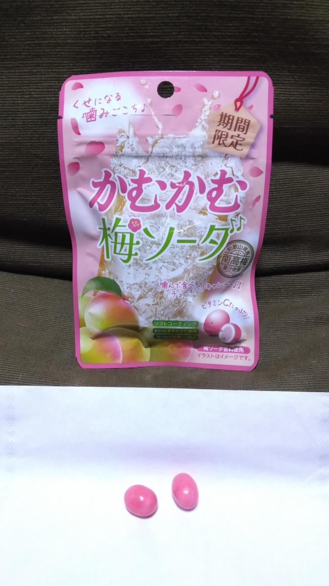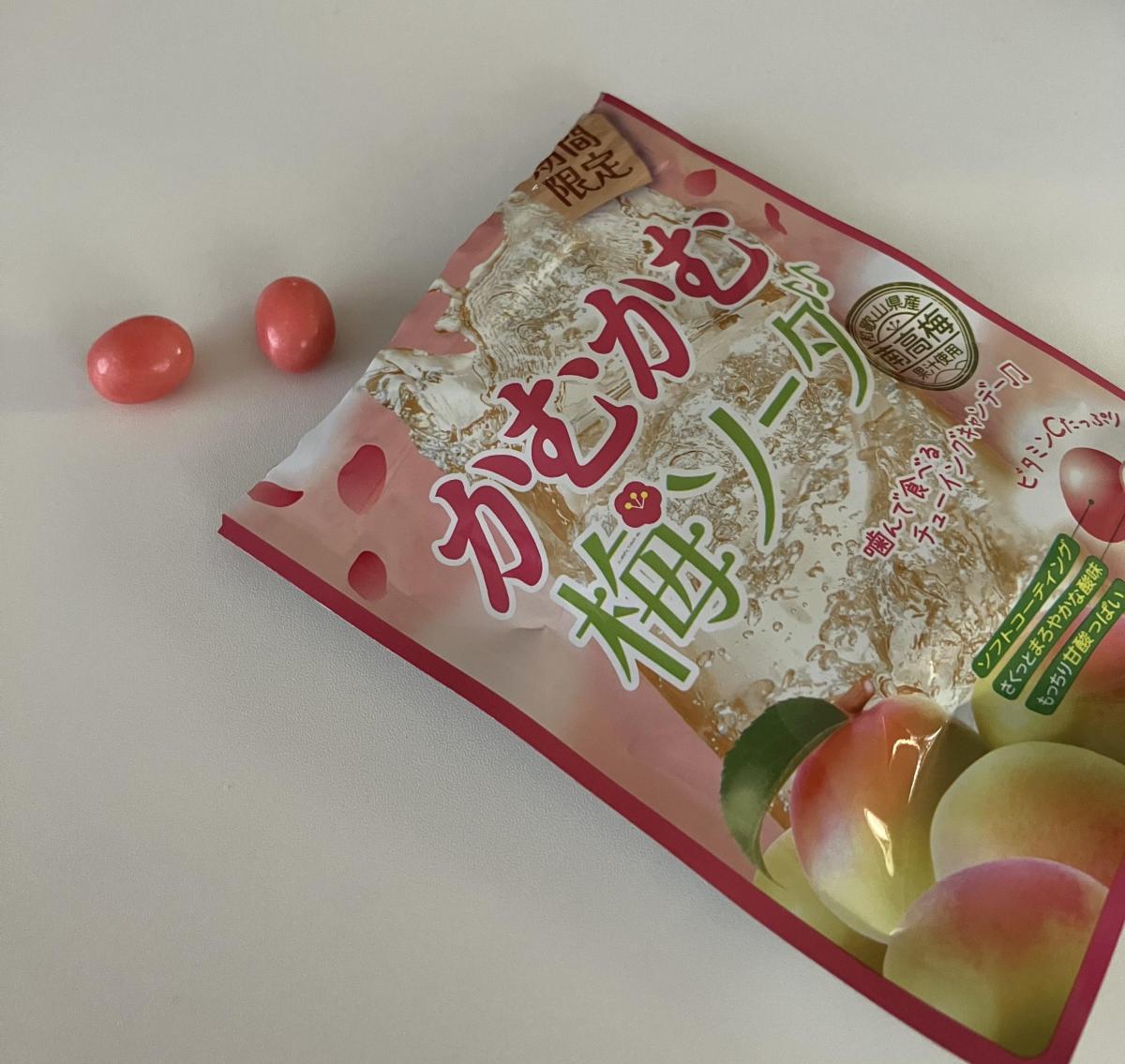 ピンク色のかわいいパッケージのかむかむ、梅ソーダ味がありました。