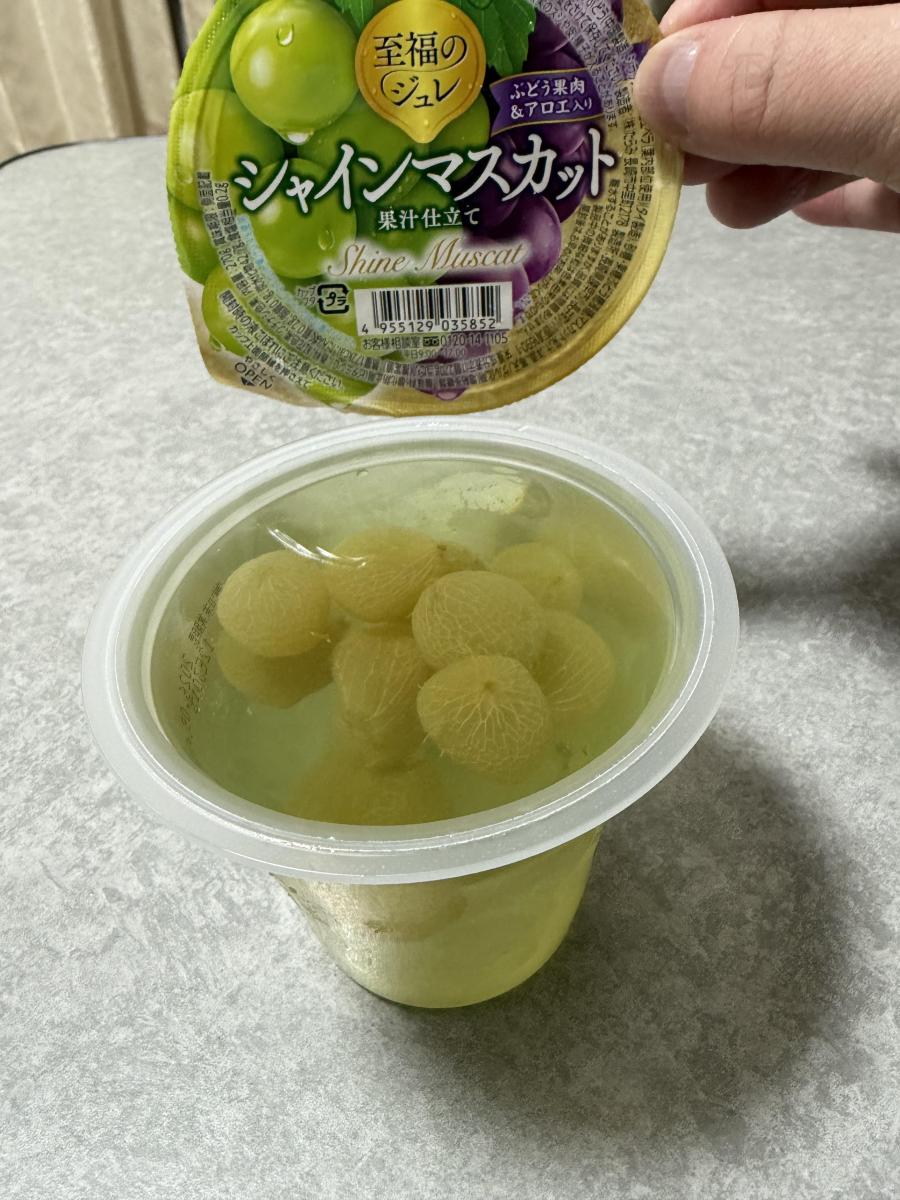 一つのゼリーにぶどうの果肉が十粒入っていました。その下にはアロエがぎっしり敷き詰められています。それらを覆うのはシャインマスカットのゼリーという構成で、至高のゼリーとはよく行ったなと言う贅沢さでした。量的にもたっぷりしており満足感がありますね。それぞれの味は他で味わえないほどビックえりする様な特別さはないものの、十分に美味しく楽しめました。