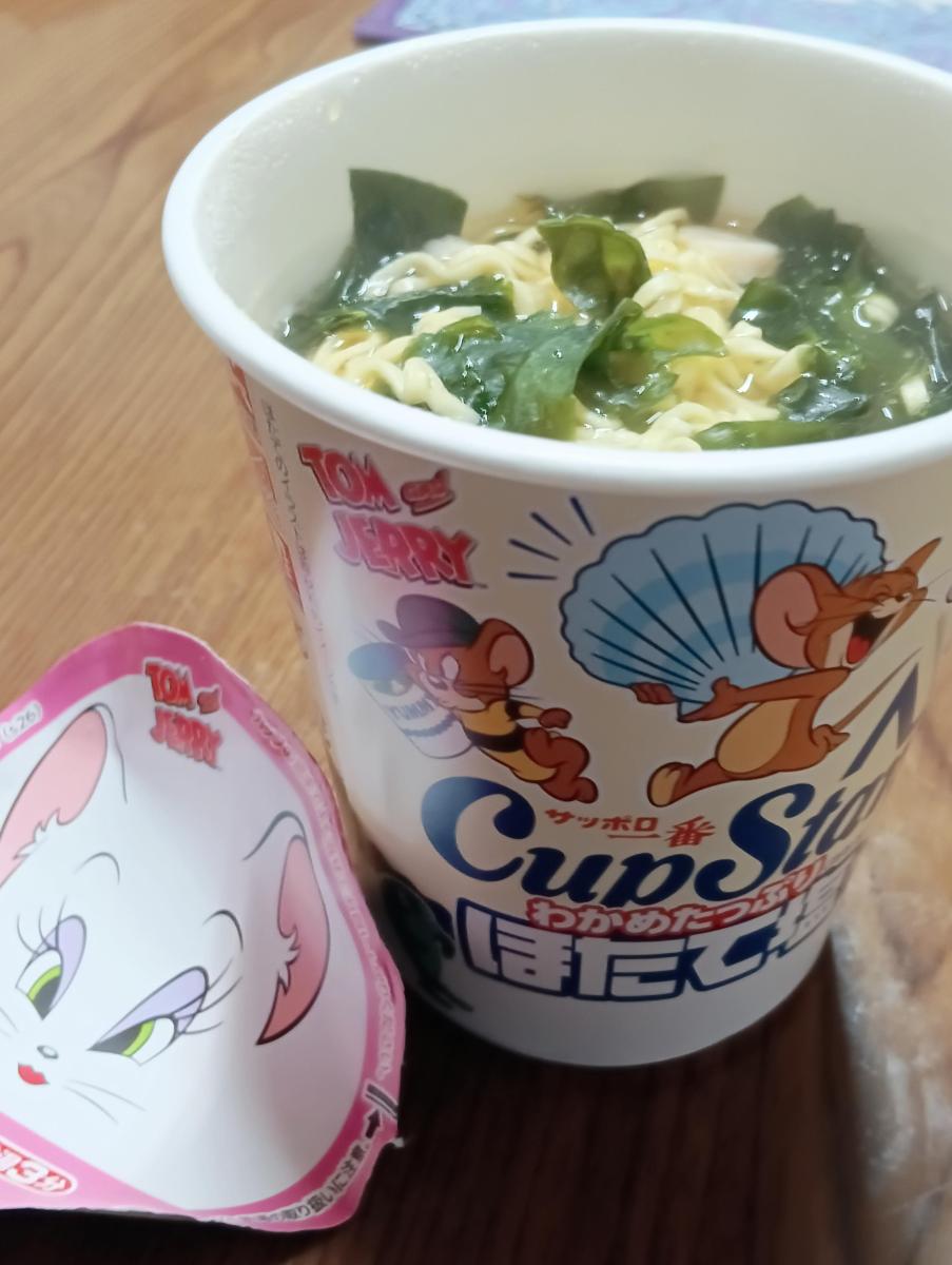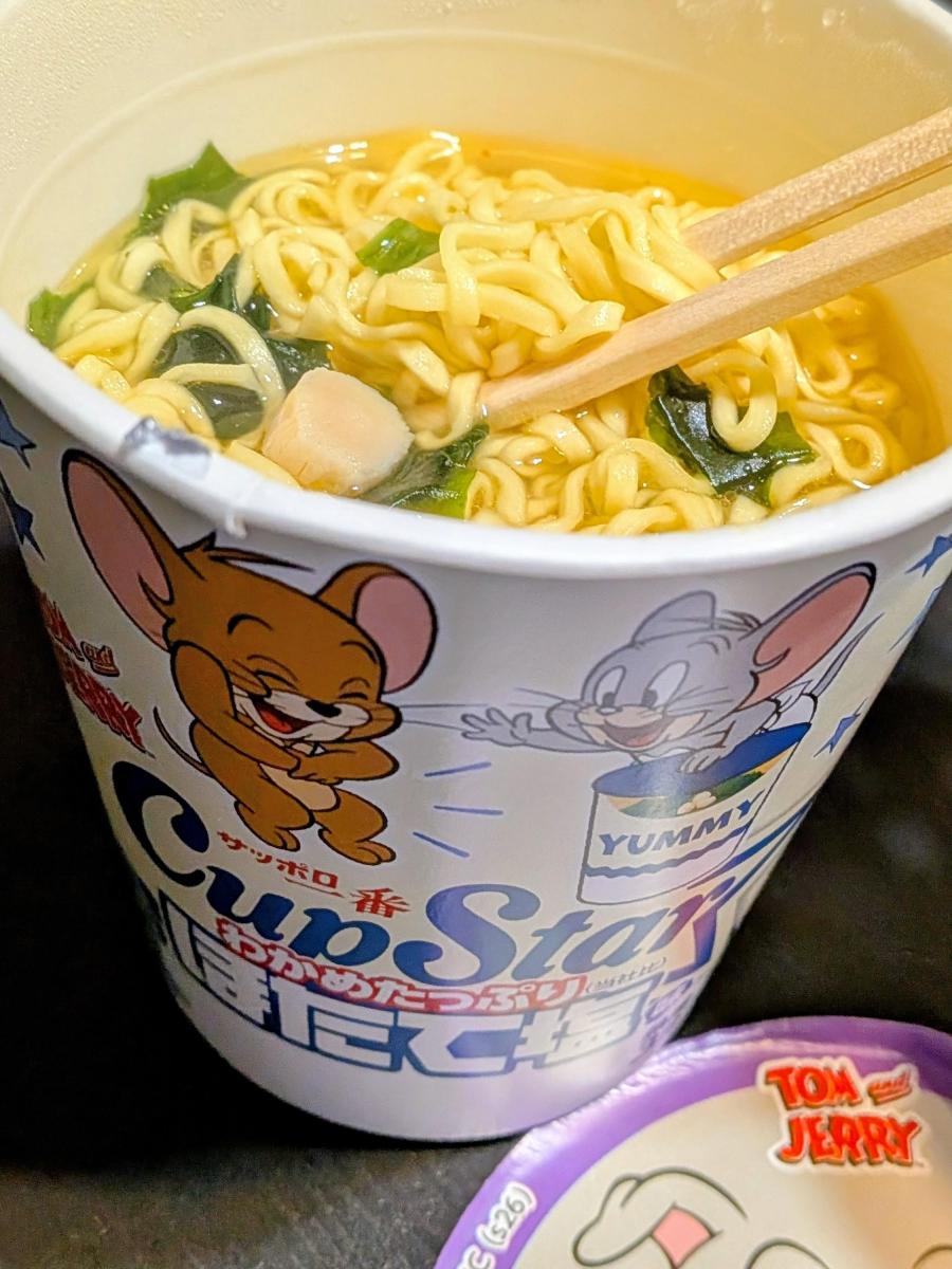 カップスターが定期的に実施するトムとジェリーコラボ、蓋にはスパイクのおかおが。パッケージにはアヒルやタイク、トゥードルズとなかなかバラエティに富んだマイナーであり愛されるキャラクターたち、センスありますね。特にネットで一時期ミーム化したさかなはシーフードとしてかけているんでしょうか(笑)今回初めてほたて塩を買ってみました。