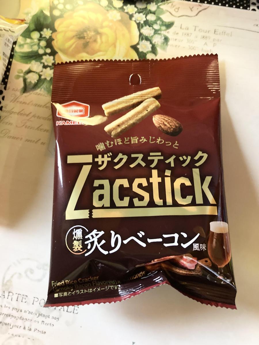 ザクスティック 燻製炙りベーコン風味のネーミングとパッケージに目が惹きどんな味か試したく購入してみました。安いので仕方ないかもですが、かなり少ない量でした。スティック形状のもち米生地で、ザクザク感がたっぷりと感じ噛み応えがあります。噛むほど広がる旨みと燻製の味わいと、食べれば食べるほど程よいコショウのピリッと感が感じ大変美味しい味わいでした。ローストアーモンドも香ばしくてスティックとのバランスがいいです。