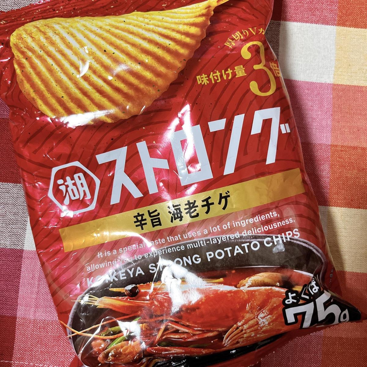 ストロング 辛旨 海老チゲ味とあまり見かけない味わいが気になり購入してみました。ポテトチップスは、少し厚みがあるギザギザポテトになっており、ザクザクと噛み応えがあり大変美味しいです。海老の香ばしい味わいがたっぷりと感じ、海老だけではなく帆立やイカなどの海鮮の旨みも感じてその後からじわじわと辛みのきいたチゲ味を感じてなんだかやみつきになるような味わいで大変美味しかったです。旨味がたっぷりなので辛いのが苦手な私でもやみつきになります。