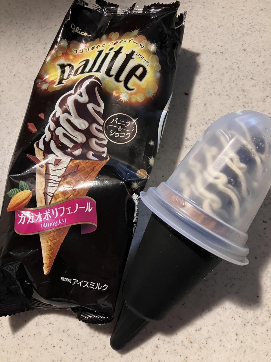ネーミングのとおり、パリパリ食感が楽しめるのがこのアイスの一番の特徴。それは見た目からもわかるところだが、上のアイス部分はバニラの渦の溝にアイスが流し込まれていて、食感はもちらんバニラとチョコレートなのでおいしくないわけがない。これがコーンよりも上の部分だけと思っていたら、コーンの中のバニラにもチョコが入っていて、さらにコーンの内側にもかなり厚めにチョコがコーティングされているので、バニラ、チョコレート、コーンというアイスクリームの看板素材の揃い踏みを存分に楽しめる。このパリッテは他のアイスよりも少し高めの価格なのだが、それだけの価値があるおいしさであるのは間違いないと思った。