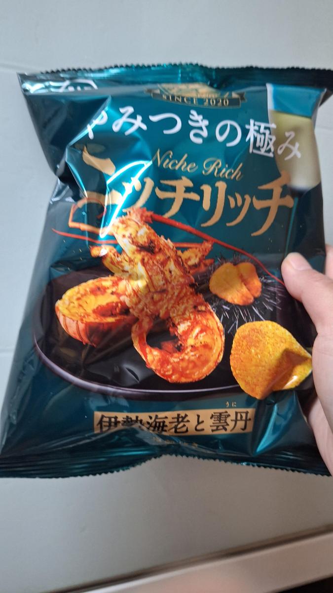 ニッチリッチ 伊勢海老と雲丹のネーミングに惹かれてどんな味か試したく購入してみました。袋開けると、香ばしい海老の香りが食欲がそそります。カリカリッと堅めな食感のポテトチップスの食感がよくてやみつきになります。伊勢海老の旨みと香ばしさ、雲丹のまろやかで濃厚な味わいが感じ、何とも贅沢な味わいで、おつまみにもぴったりな味わいだなと思います。