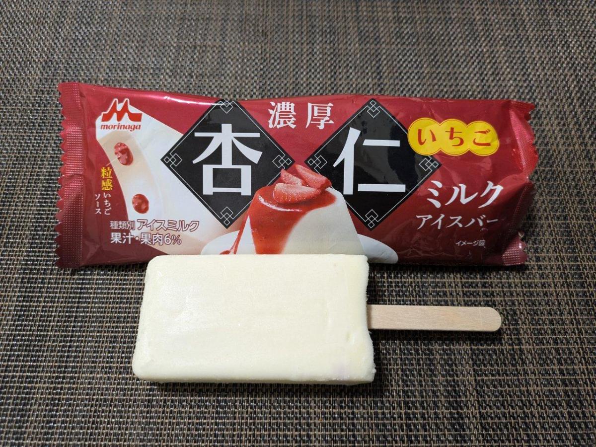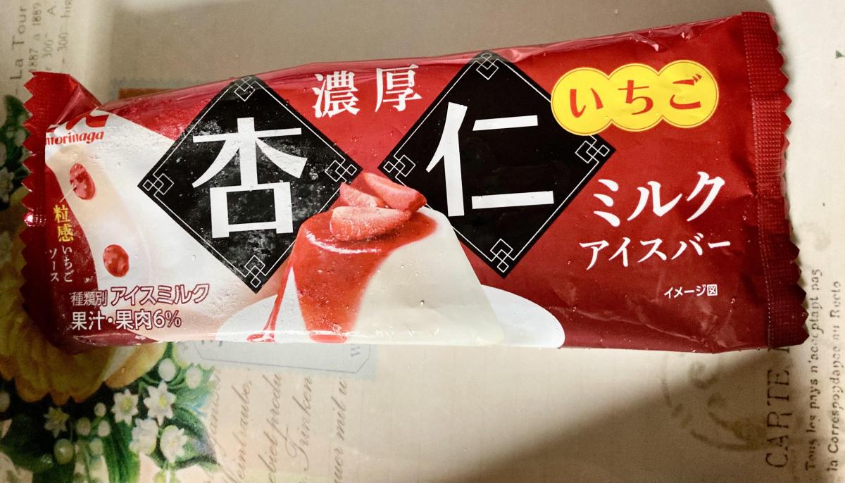 濃厚杏仁ミルクアイスバーいちごのネーミングとパッケージに目が惹きどんな味か試したく購入してみました。アイスはねっとりとした食感でしっかりミルキーで甘めです。杏仁はそこまで強くはないですがミルク感のあとに杏仁の香りと風味が感じました。いちごソースは、やさしい甘さでほんのり酸味があり、杏仁アイスとのバランスがいいです。