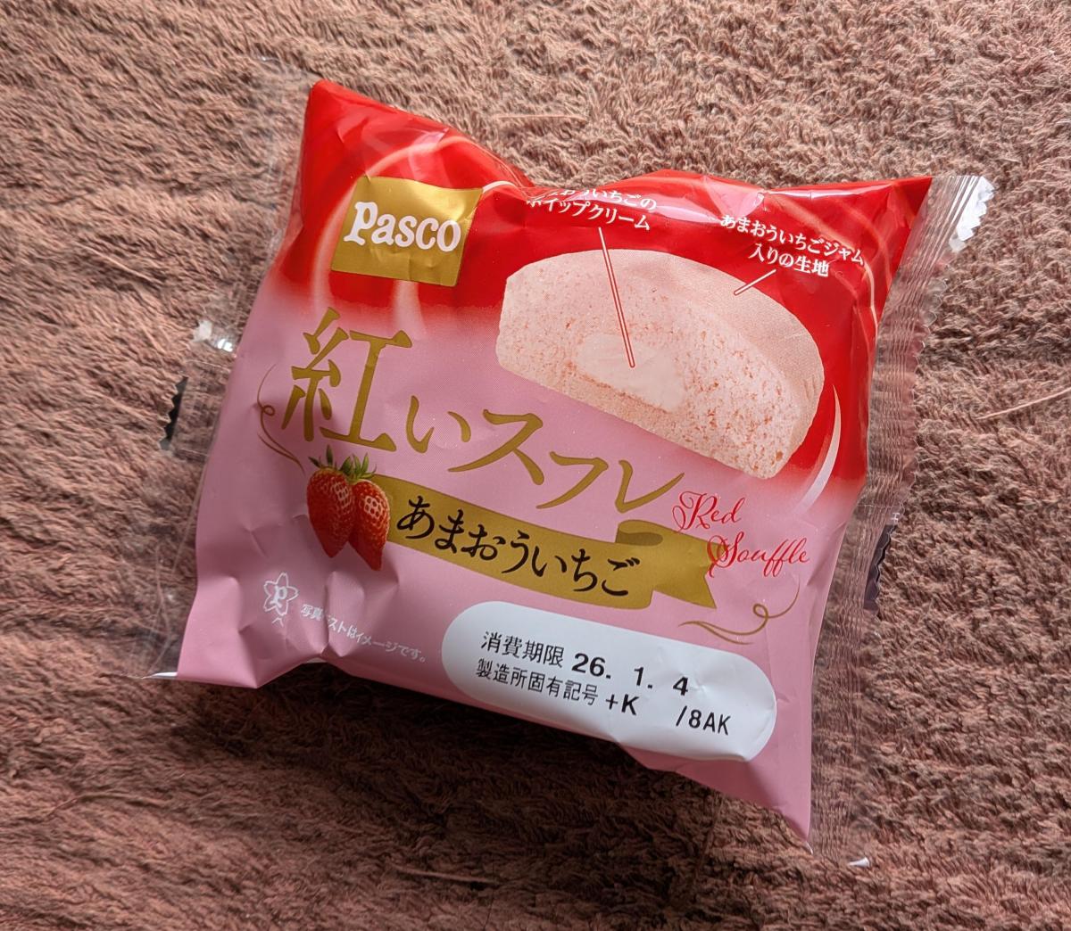 紅いスフレ あまおういちご味のネーミングに惹かれてどんな味か試したく購入してみました。生地はとてもキメ細やかでフワフワ、柔らかくて甘くてまろやかないちご風味で、美味しいです。いちごホイップはなめらか少し油脂感もあるようなミルキーないちごの味わいでやや甘めです。いちごの酸味があまり感じられなかったのが少し残念でした。