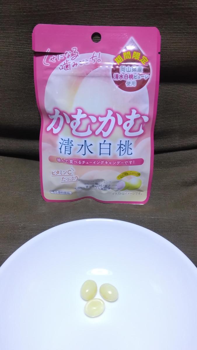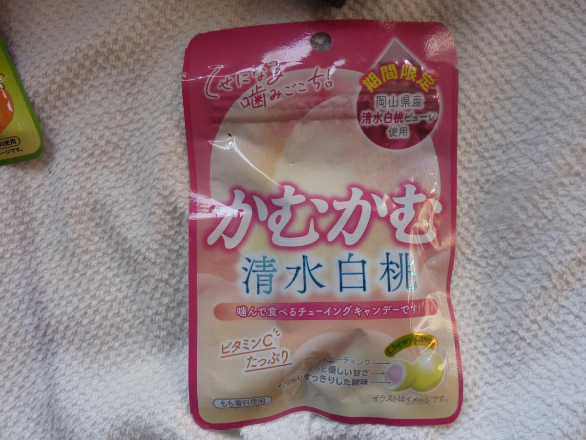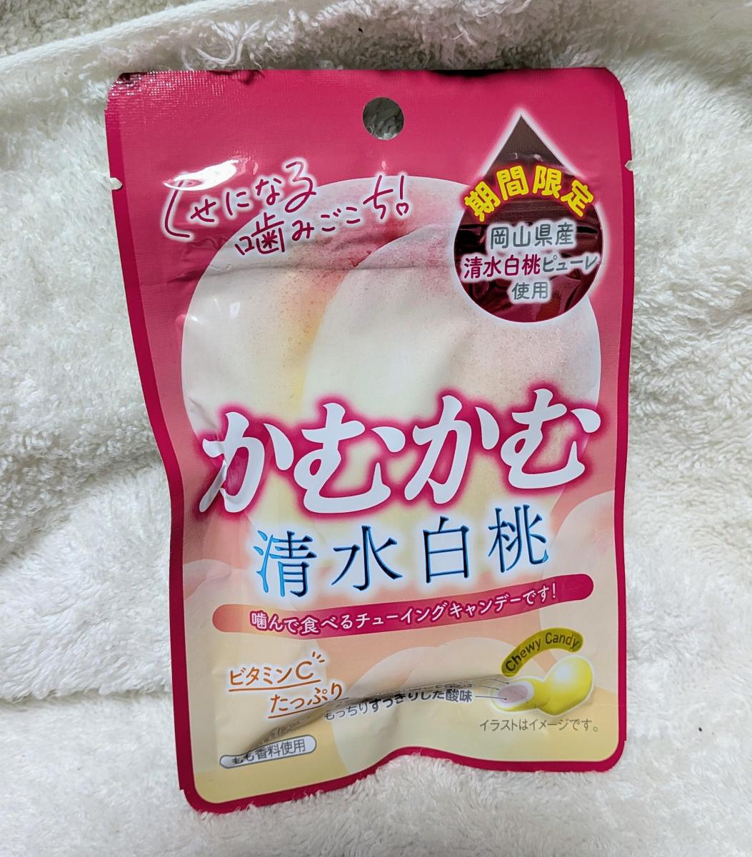 清水白桃の味のかむかむキャンディーが出ていました。かむかむキャンディーは、結構好きなので、楽しみです。