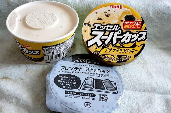 薄いイエローのバナナのアイスに砕いたブラックのチョコクッキーが散らばって、入っていました。スーパーカップはたっぷりサイズで、1度に食べられないので、数回に分けていただきました✧˖°
