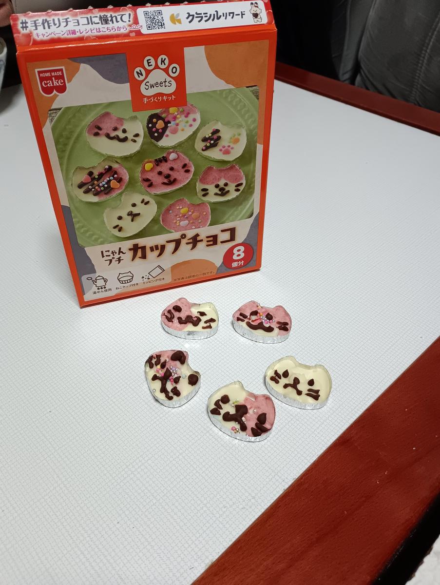 今月のおすすめポイントはかわいい美味しい楽しめるバレンタインデーキットです。皆さん、どんなバレンタインデーでしたか?ウェブサイトのキャンペーンをきっかけに初めて知り、購入しました。この商品のメリットは、ねこ型アルミカップがかわいい。ホワイトチョコをベースにフリーズドライのいちごを混ぜてかわいいピンクにできる。つまり2色のチョコレートが楽しめるのです。子供達大喜びで作りました。トッピングのアラザンやハートのシュガーもかわいい。最後にミルクチョコレートのデコペンでかわいい猫の顔が完成します。かわいいづくしで楽しい商品です。さて、食べてみると、ホワイトチョコレートはまろやかなミルクの味わいが美味しいです。フリーズドライのいちごが入ったチョコはいちごの甘酸っぱい味わいが調和して美味しいです。デコペンも入って大変お得なセットです。ただ、デメリットとしてチョコレートが制作中に固まるのが早い!何度も湯煎にかけては溶かしを繰り返してなんとかかわいいのが出来ました。まだお店に残っていたら、是非チャレンジして下さいね。手作りの美味しさは格別です。