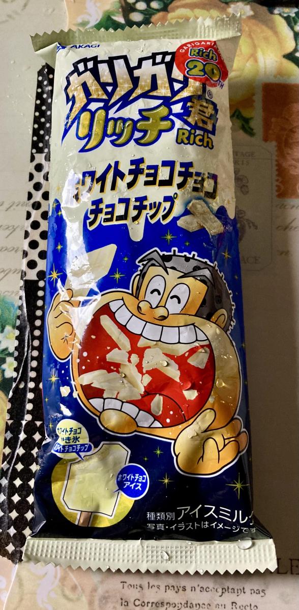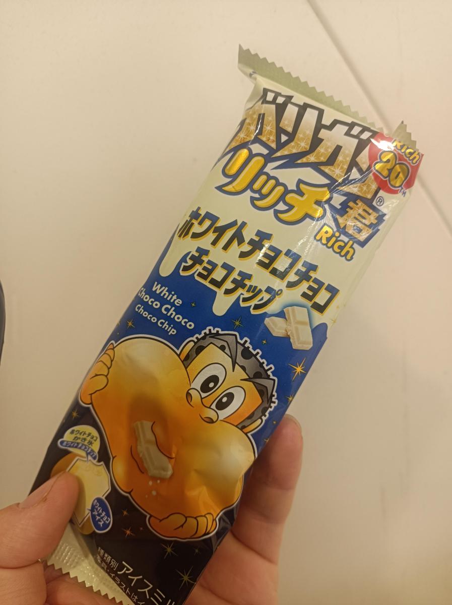 ガリガリ君リッチ ホワイトチョコチョコチョコチップのネーミングとパッケージに目が惹きどんな味か試したく購入してみました。袋から取り出すとやわらかめの質感で溶けやすいため、いつものガリガリ君と全然違う食感です。最初に練乳のような甘さを強く感じます。その後にホワイトチョコ感の風味がしっかり感じ、チョコチップのコリコリ感がとても良いアクセントで、大変美味しい味わいでした。