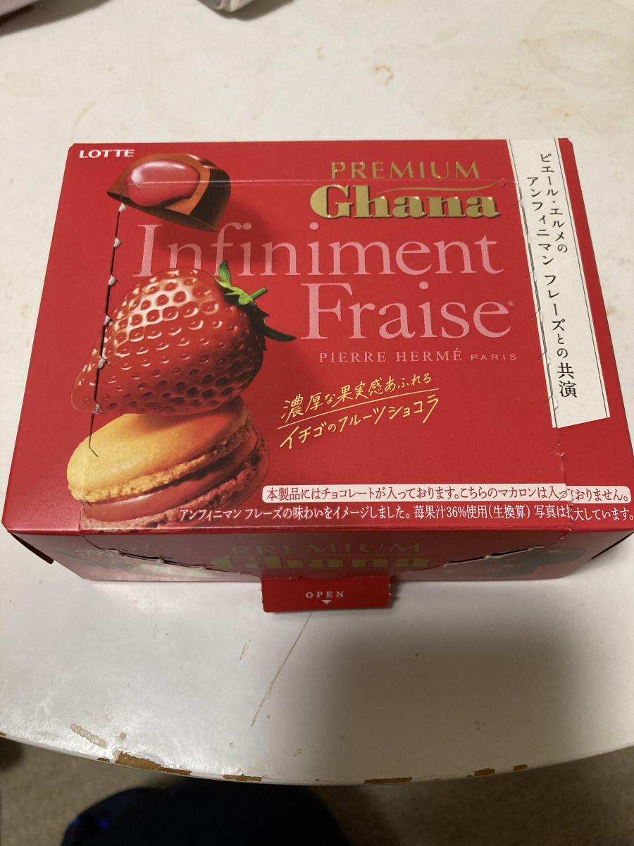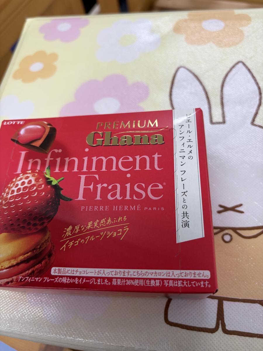 プレミアムガーナ フルーツショコラ<アンフィニマン フレーズのネーミングとパッケージに目が惹きどんな味か試したく購入してみました。小分けされているのでシェアできて大変便利です。チョコは少しカリッとしており、中からとろりと苺ソースが溢れてきます。チョコはミルクチョコのような少しミルキーで甘めの味わいで、苺ソースはしっかり濃厚な味わいで、酸味も感じ大変好みな味わいで美味しかったです。まさしくプレミアムな気分になりました。
