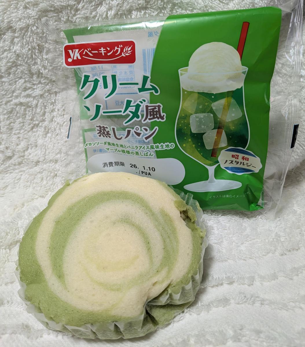 クリームソーダ風蒸しパンのネーミングとレトロなパッケージに目が惹きどんな味か試したく購入してみました。きれいなソーダ色でマーブル模様になっていました。蒸しパンは、ふんわりしっとり感がたっぷりでなめらかで食べやすい食感です。メロンソーダ風味と甘みがたっぷりなバニラアイスの味わいで、クリームソーダ味で懐かしさがかんじました。