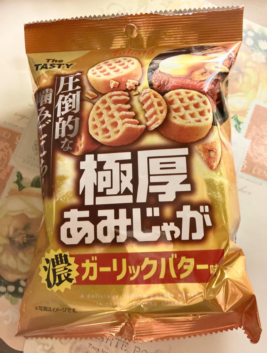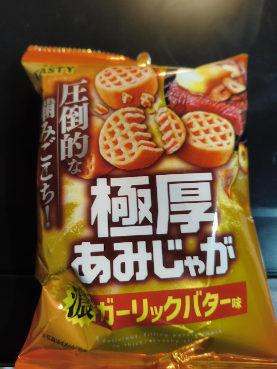 極厚あみじゃが・濃ガーリックバター味のネーミングに惹かれてどんな味か試したく購入してみました。袋開けるとバターの香りが漂いました。あみじゃがはかなりの極厚で1つでもガリガリザクザクとかなりの噛み応えがり、食感も楽しめます。食べ応えも抜群です。食べていくうちに、ガーリックがじわじわと漂って濃厚さが感じました。