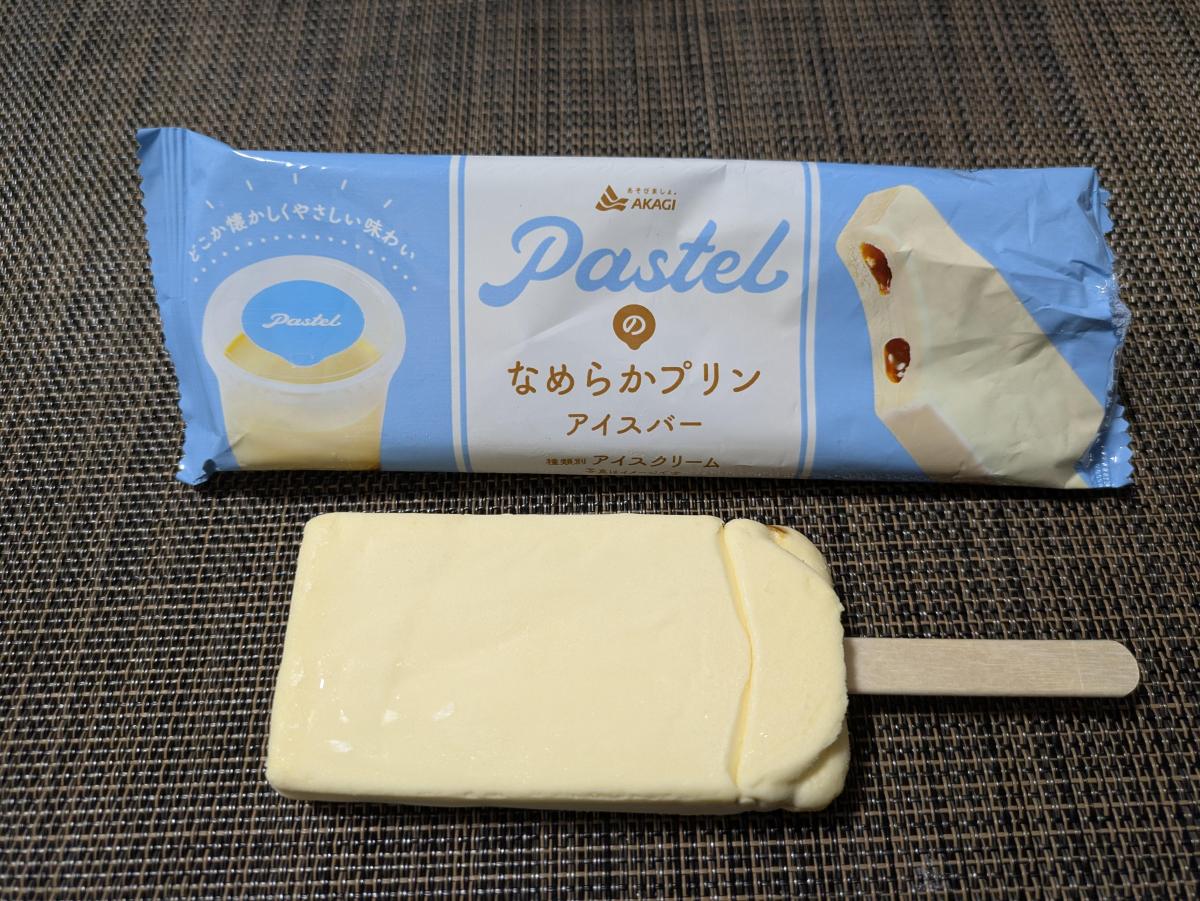 棒アイスの中にカラメルソースの2本の筋が通っています。アイスとソースを一緒に食べるとプリン味。アイスだけ食べているとプレミアムアイスのバニラみたい。パステルのプリンはいい意味でプリンっぽくない、クリームみたいなおいしさなんだなと実感します。