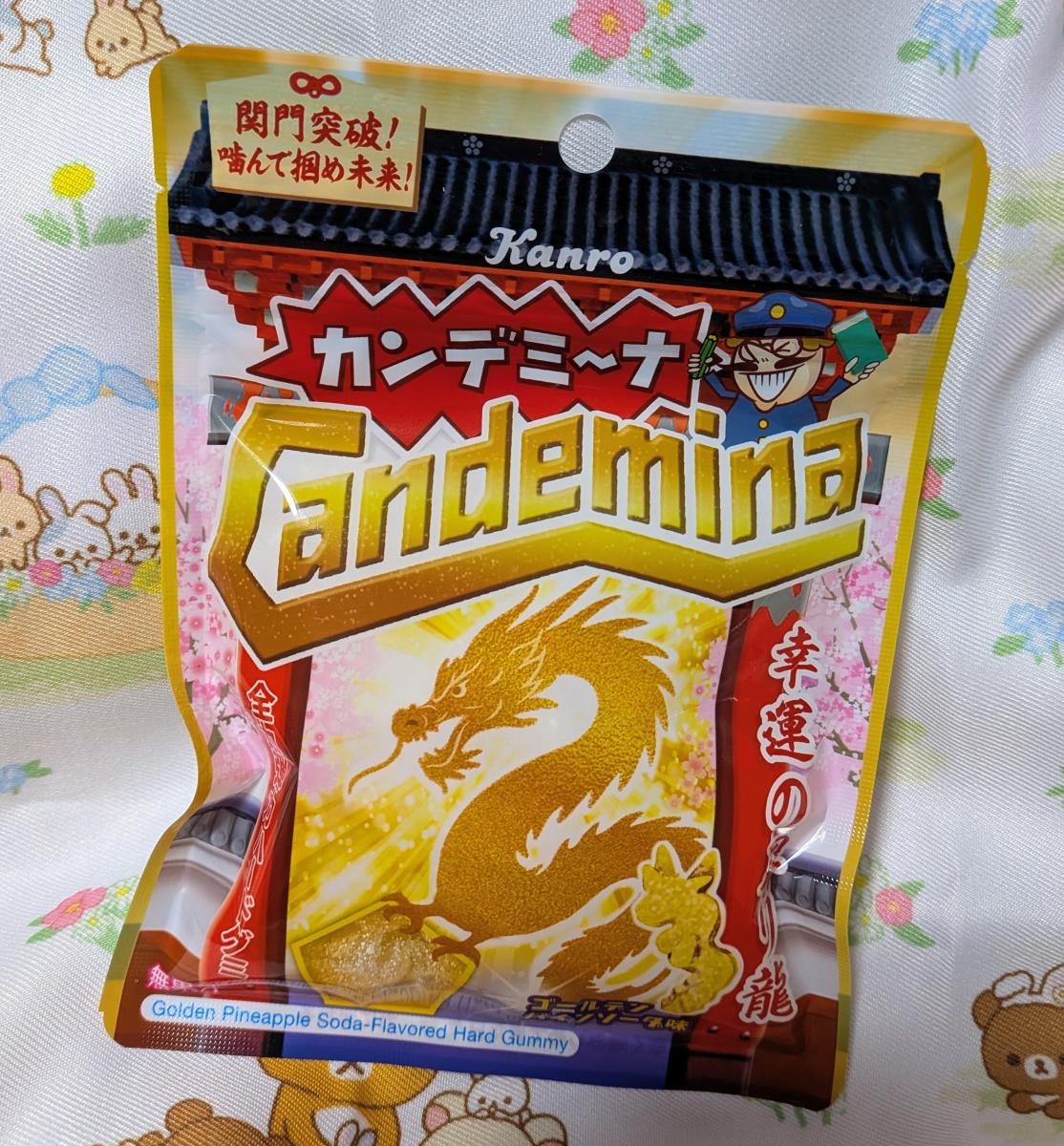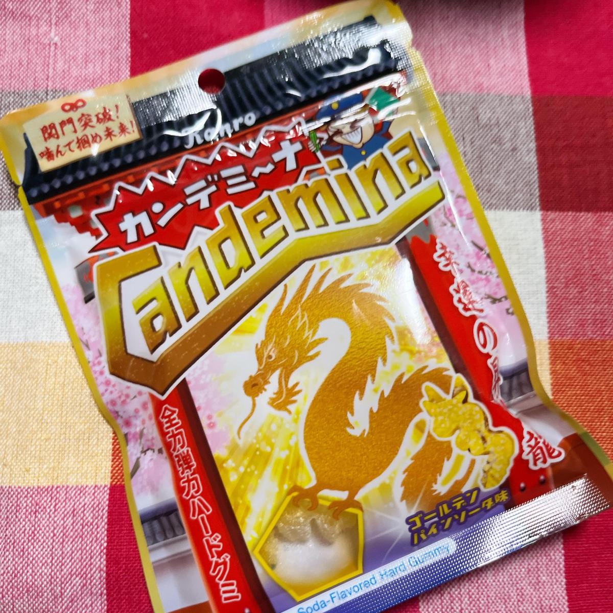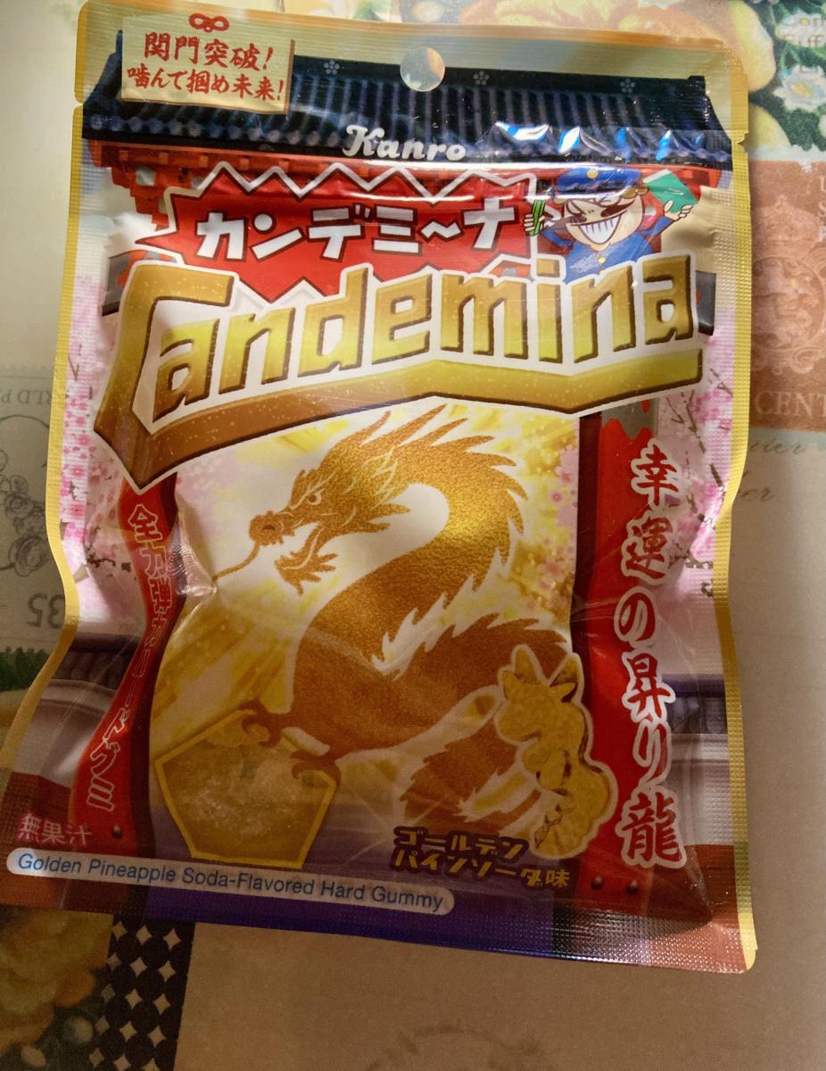 カンデミーナグミ 幸運の昇り龍のネーミングとパッケージに目が惹きどんな味か試したく購入してみました。袋から出すと龍の形したグミが出てきて、1粒が小さめです。ですが、格好ハードめな食感で噛み応えありました。味はパイナップルの甘みと酸味がしっかりと感じ噛めば噛むほどジューシーさが感じ、酸っぱい好きにはぴったりな味わいでした