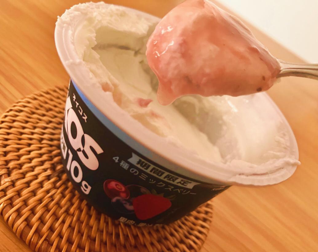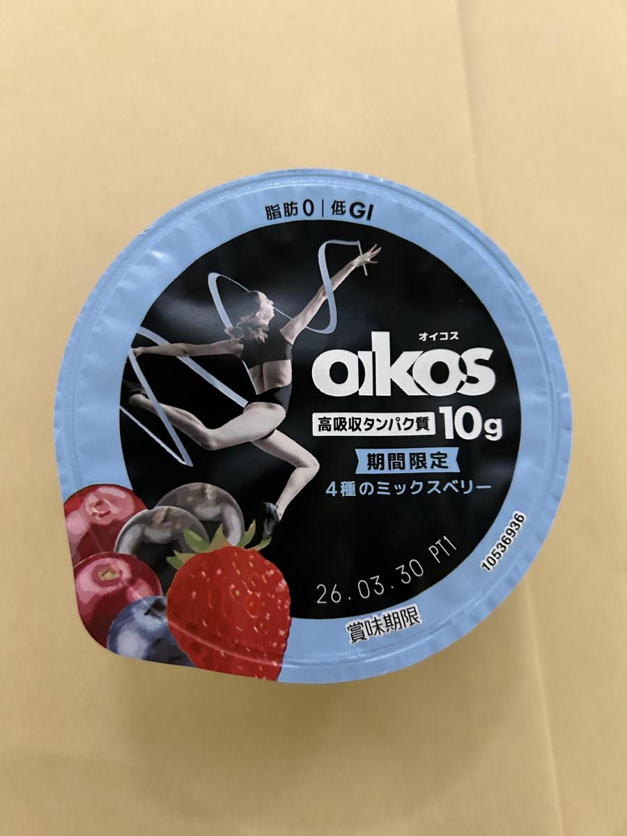 1カップで、たんぱく質がゆで卵と同じくらい10gもとれるヨーグルトです。朝から卵料理を食べれないので、オイコスを代わりに食べたりします。カップの底に4種のミックスベリーのソースが入ってます。ベリーの香りが豊かで、ほんのり甘酸っぱいです。