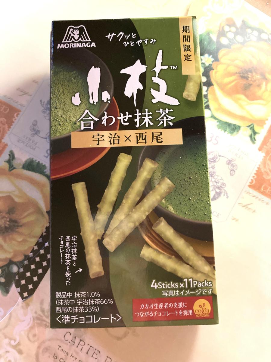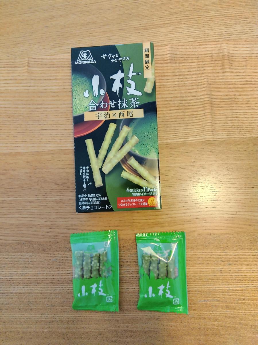 抹茶大好きで森永製菓 小枝 の合わせ抹茶が大変気になり購入してみました。小分けされているのでシェアできて大変便利です。期間限定だそうで、小枝は、いつも通りパリッとサクサクした香ばしい食感がいい感じです。宇治抹茶と西尾抹茶の2種類を使用しており、甘さと抹茶の苦みが感じられ大変美味しい味わいでした。美味しかったです。