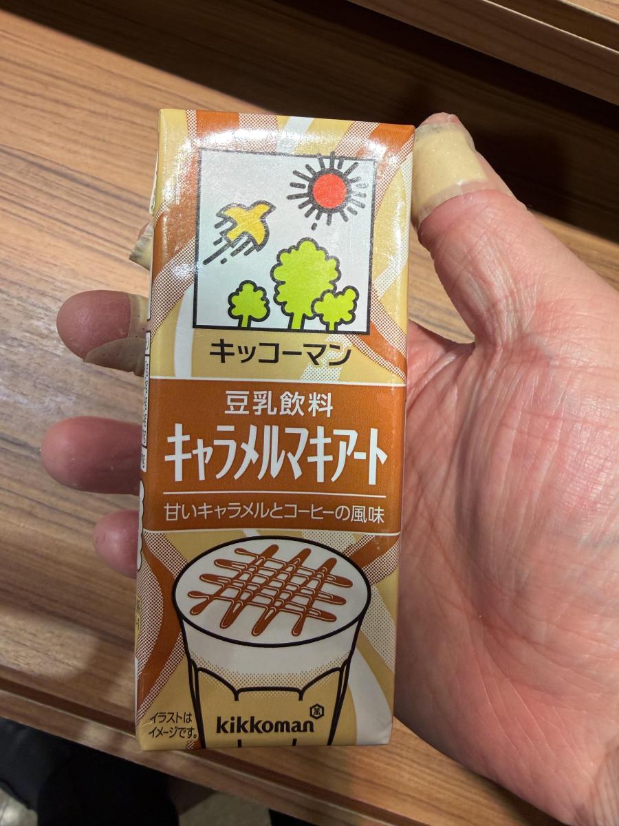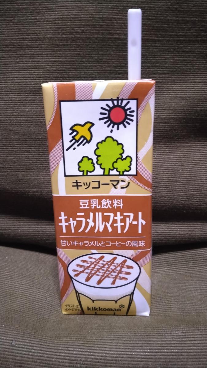 見慣れないデザインの豆乳飲料がありました。キッコーマンさんの豆乳飲料、キャラメルマキアート味です。