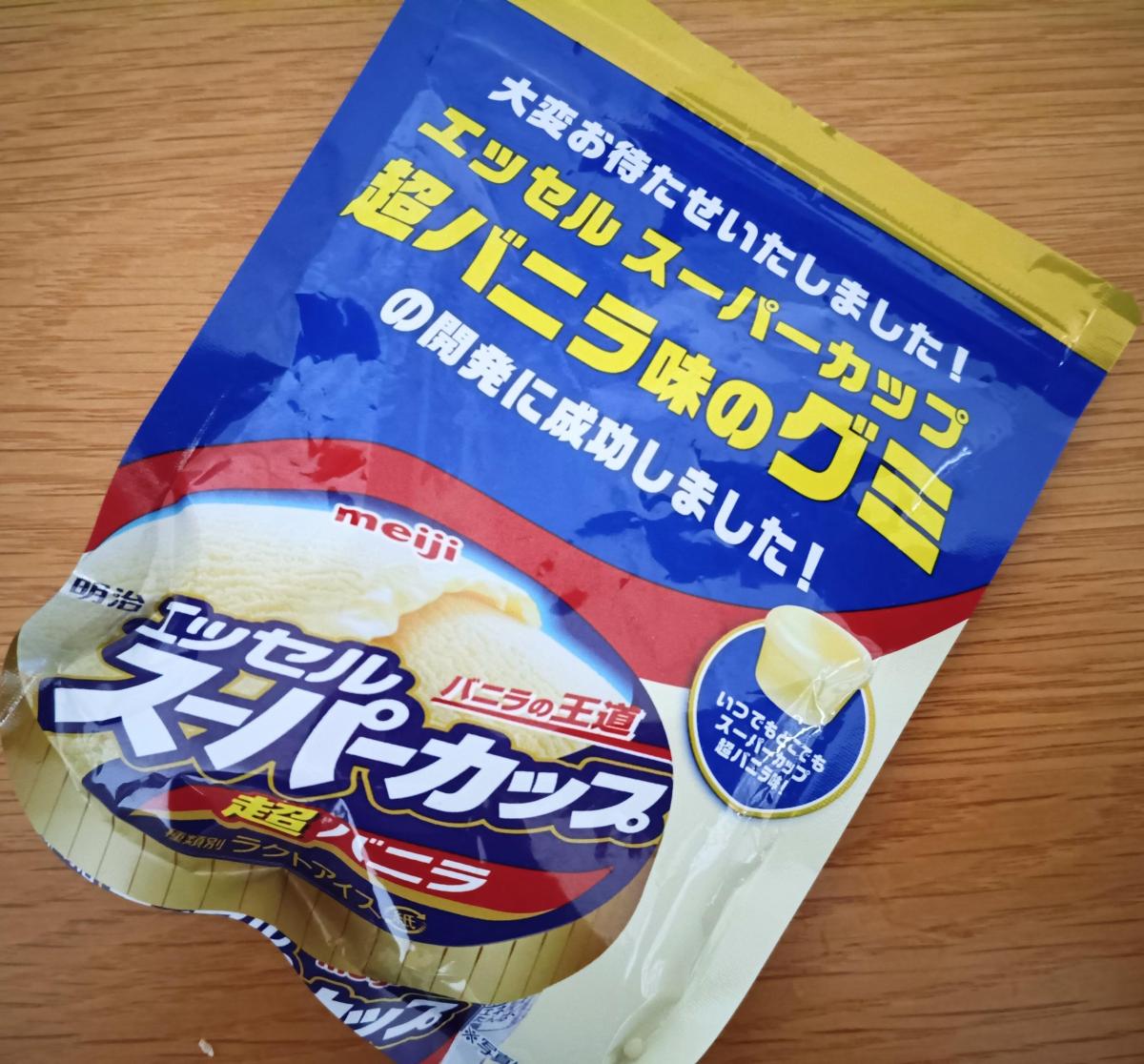 エッセルスーパーカップ超バニラ味のパッケージに目が惹きどんな味か試したく購入してみました。グミは、もっちりとした柔らか系のグミの食感でした。スーパーカップ 超バニラのコクのある味わいがたっぷりで、味の再現力がすごいです。ですが、甘みが強すぎて、グミ食べている感覚があまり感じられず、甘すぎて少量で十分に感じました。グミは酸っぱいイメージだったので何だか不思議な味わいでした。