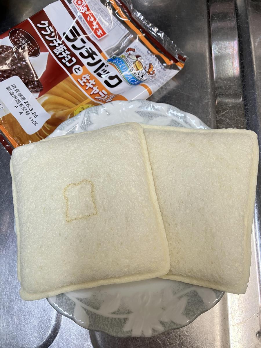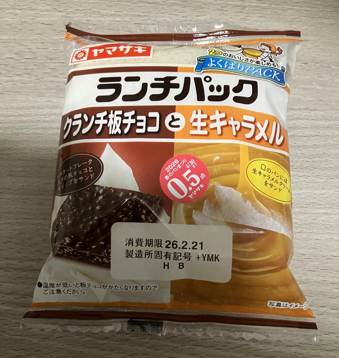 クランチ板チョコと生キャラメル味が大変気になり購入してみました。パンは、ふわっとふんわり軽くて柔らかくてパサつきも無くて食べやすい食感です。食パンマークのパンには生キャラメルクリームが入っており、甘さがたっぷりで。とろりとねっとり美味しい味わいです。一方のパンにはビスケットフレーク入りの板チョコとホイップが入っており、ザクザクとしたチョコで食感が楽しめてよかったです。