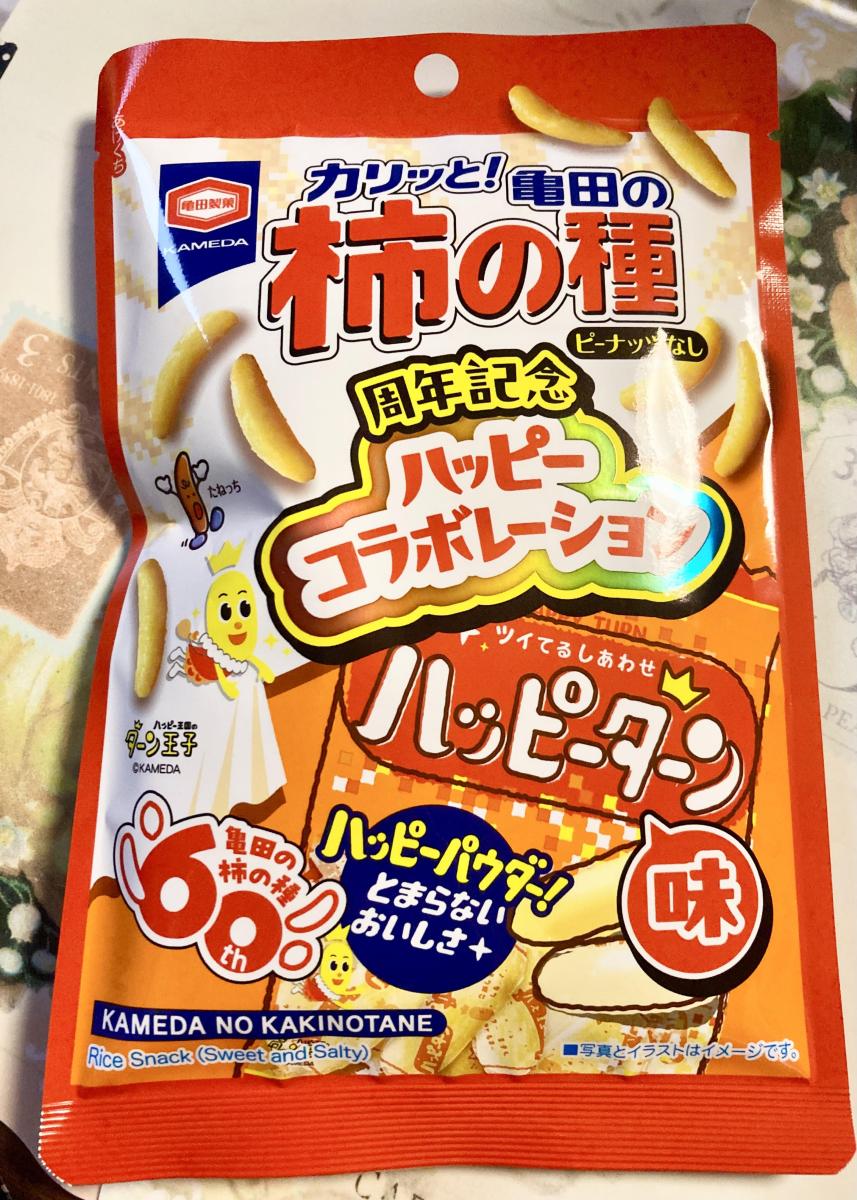 亀田の柿の種 ハッピーターン味のパッケージに目が惹きどんな味か試したく購入してみました。柿の種のカリカリッとした食感はいつも通りで軽くて美味しくてやみつきになります。ハッピーターンのあの甘じょっぱいパウダーが、しっかり柿の種についており、優しい甘さとコクのあるパウダー味で濃いめでしたが、大変美味しかったです。