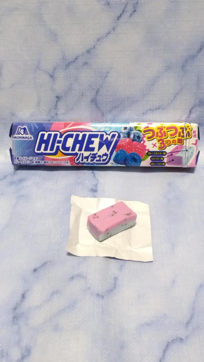 ハイチュウのつぶつぶベリーミックスのネーミングとパッケージに目が惹きどんな味か試したく購入してみました。開けると、すごい色合いにびっくりしましたが、食べてみると、最初にブルーベリーの香りがたっぷりと感じ、後からラスベリーの甘酸っぱさがほのかに感じ美味しい味わいでした。つぶつぶが入っているので、ジャリジャリした食感もアクセントで美味しかったです。