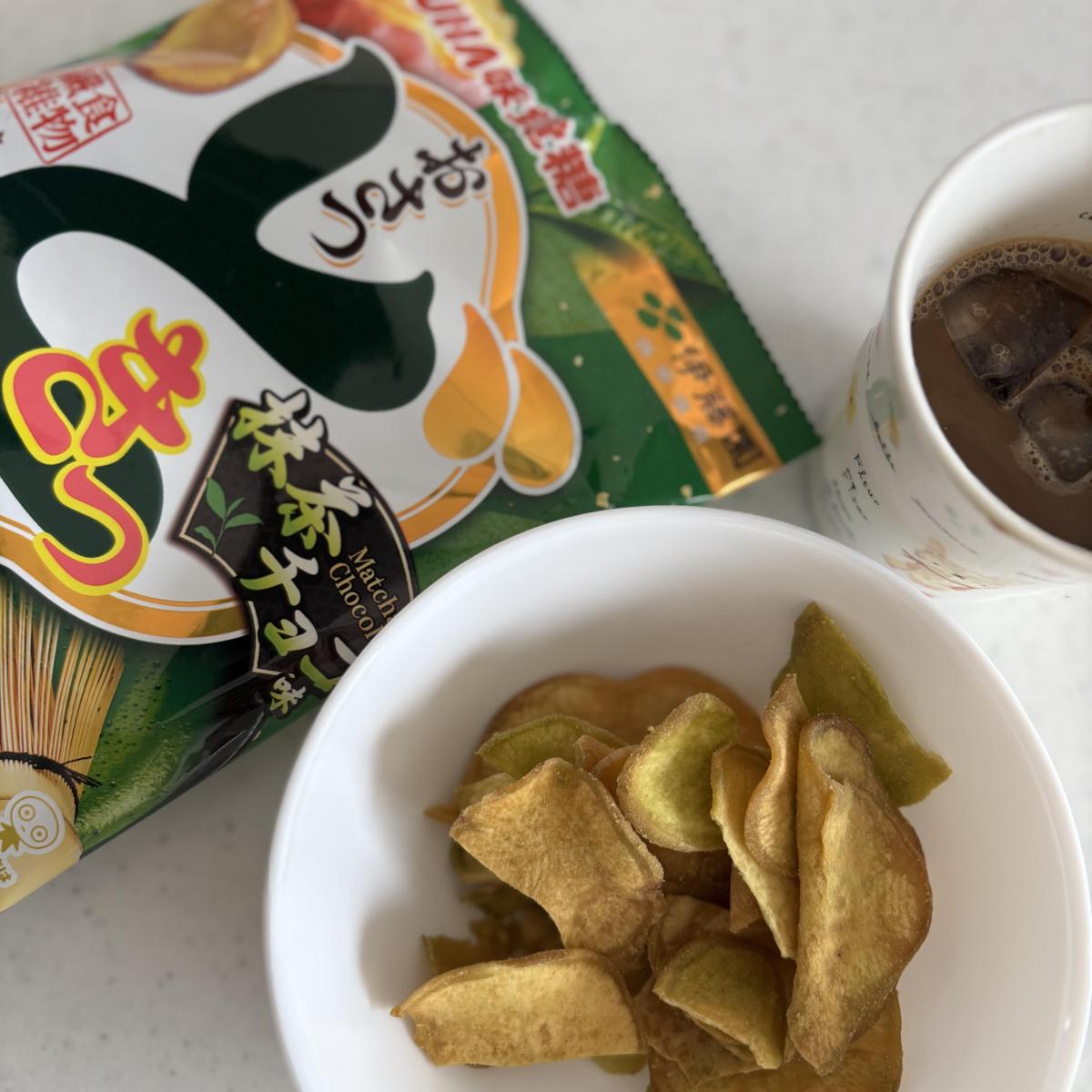 いつものおさつどきっの食感に抹茶チョコ味。何だか違和感あります。でも食べていくうちに違和感がなくなってくる感じ。抹茶チョコもさつまいもの味もちゃんとします。抹茶は伊藤園さんの物を使用しているそうです。
