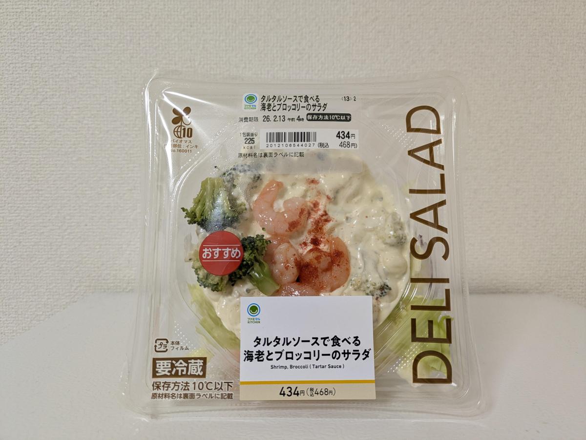 たっぷりのタルタルソースと海老とブロッコリー、キャベツ・レタス・紫玉ねぎの野菜のサラダ。タルタル以外のドレッシングは特に無く、和えて食べる感じかな。タルタルと野菜はトレーが別になってるけどタルタルがうまくすくえず… タルタルは具材感がありつつ王道のあるおいしさで、海老もぷりっとしておいしい!たっぷり量で野菜と合わせても薄くならない。 けど…キャベツが大きめの角切りなのが残念。たまたまなのかもしれないけど芯のような部分が多くて、サイズも大きいから食感も目立つ。タルタルや海老との相性も微妙。葉物野菜はレタスだけの方が良かったなぁ。 税込468円と高く感じる値段で、タルタルソースは好みの味だったけどキャベツが好みではなくリピートはなさそう。