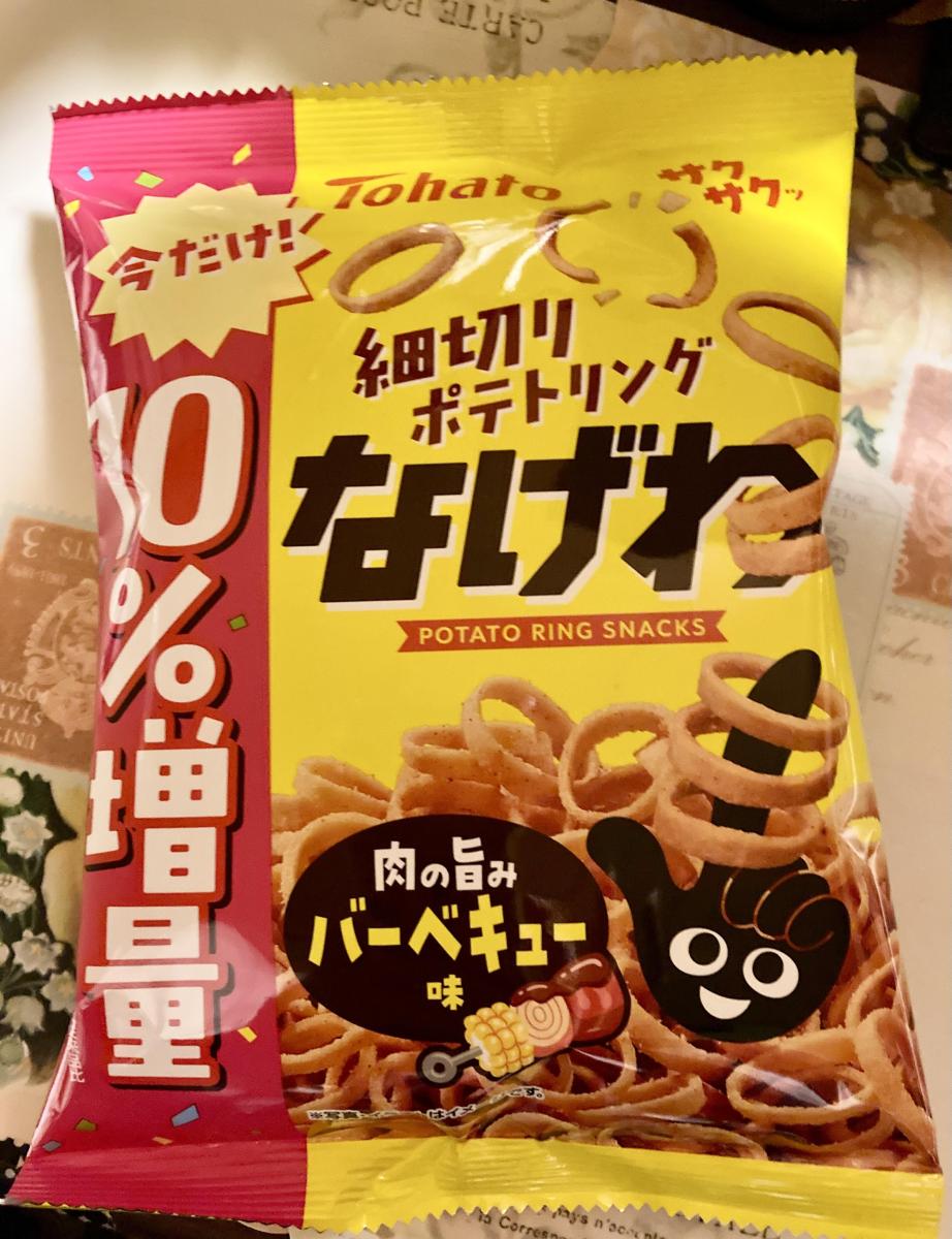 なげわのバーベキュー味が気になり購入してみました。パッケージの色合いもいい感じです。なげわは細身ですが、パリパリサクサクとした食感が美味しくてやみつきになります。じゃが芋にトマト、玉葱、焼肉のタレを混ぜ合わせた様なちょっと甘めなバーベキュー味で食べやすくて美味しかったです。コスパもいいのでまた購入してみたいなと思いました。