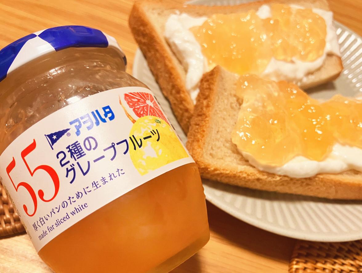 大好きなアヲハタジャムから大好きなグレープフルーツのジャムが!迷わず購入。南アフリカ産とイスラエル産の2種類のグレープフルーツを使用しているとのこと。