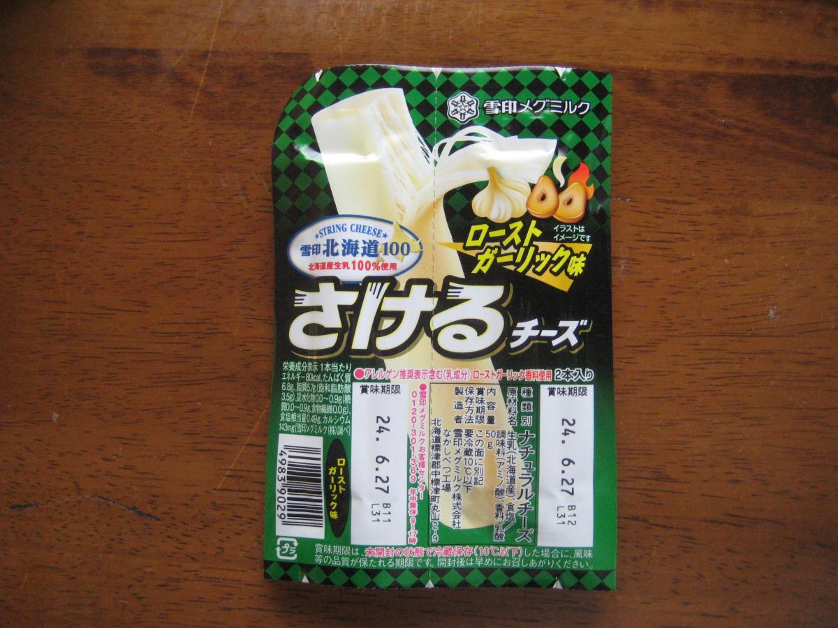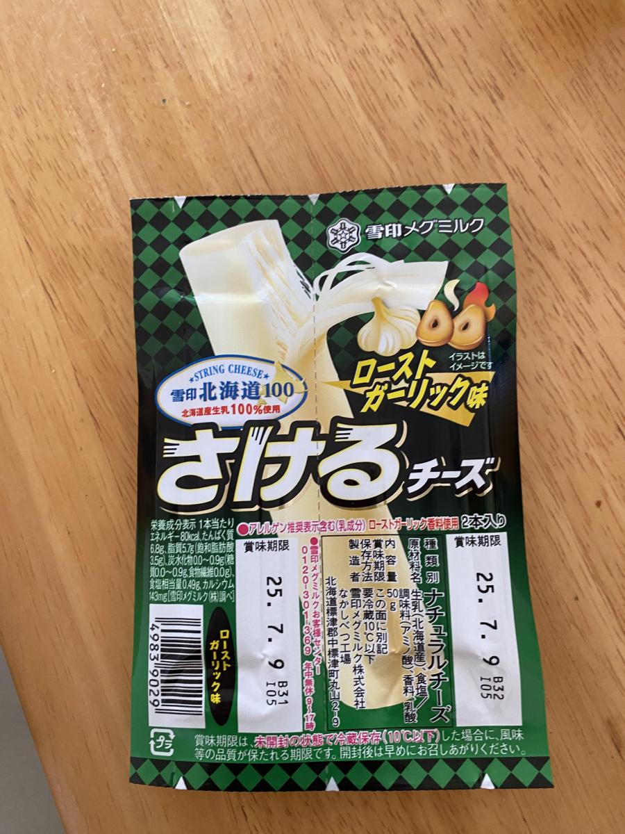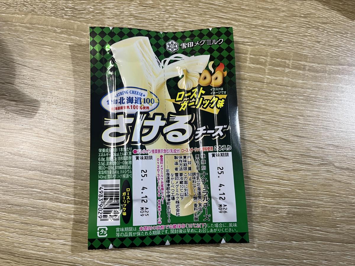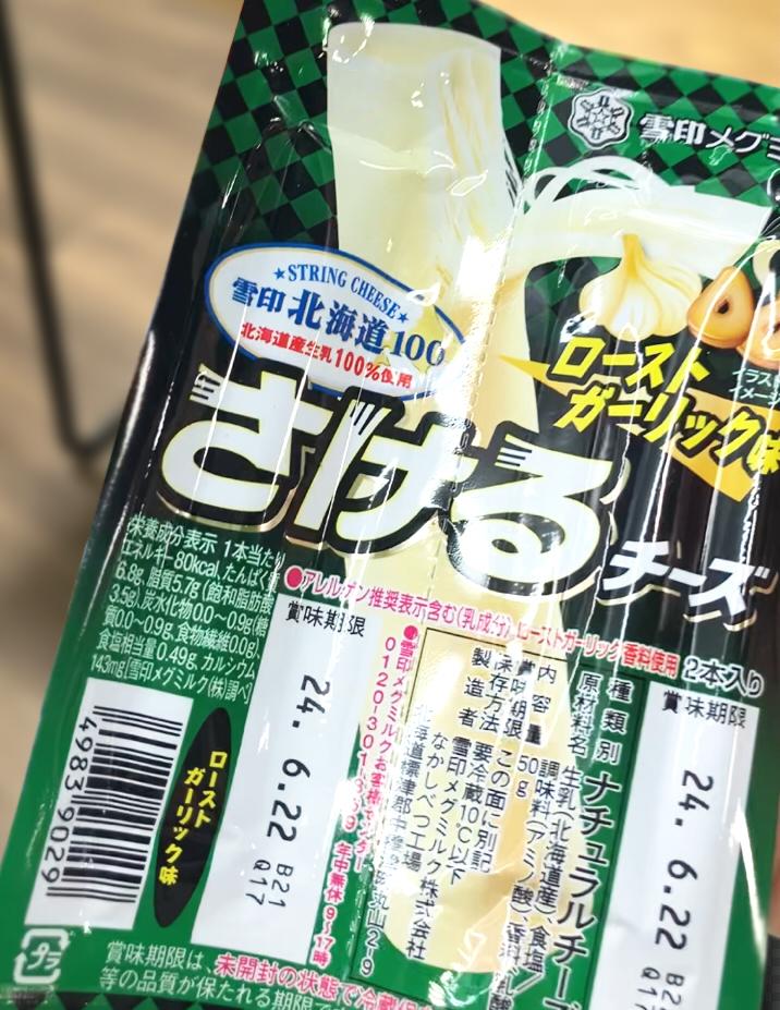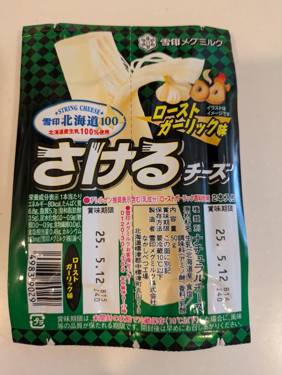さけるチーズが食べたいなと思いスーパーに行ったら、今は色んな味があるんですね。今回はローストガーリック味を買ってみました。ガーリック味で外れるわけがないです!美味しいです!