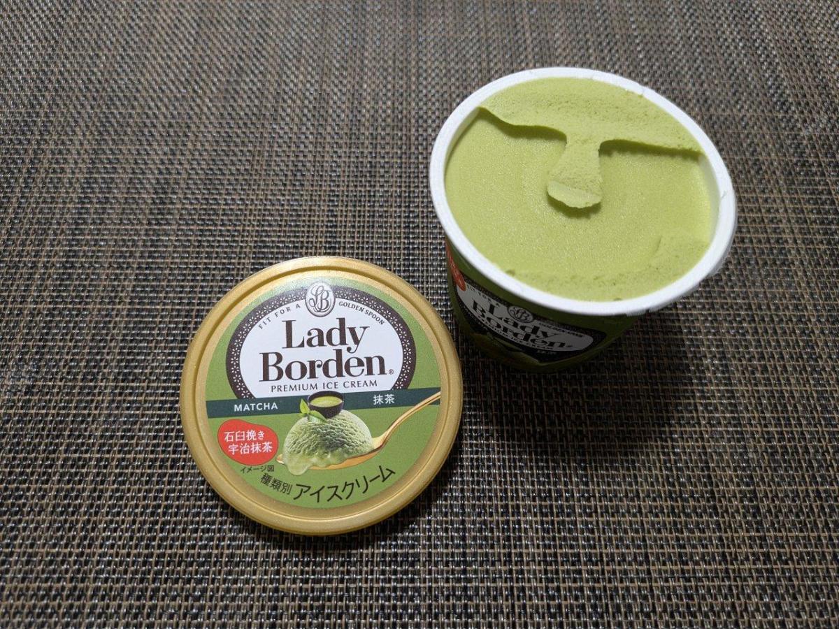 深いグリーンのカップのアイスクリームを見つけました。レディーボーデンの抹茶アイスクリームということで、すごく楽しみです。