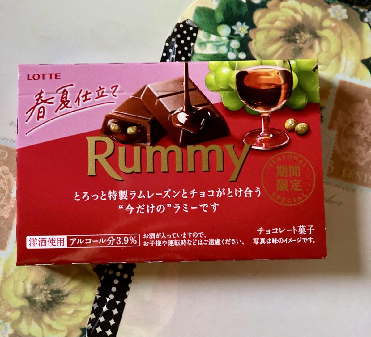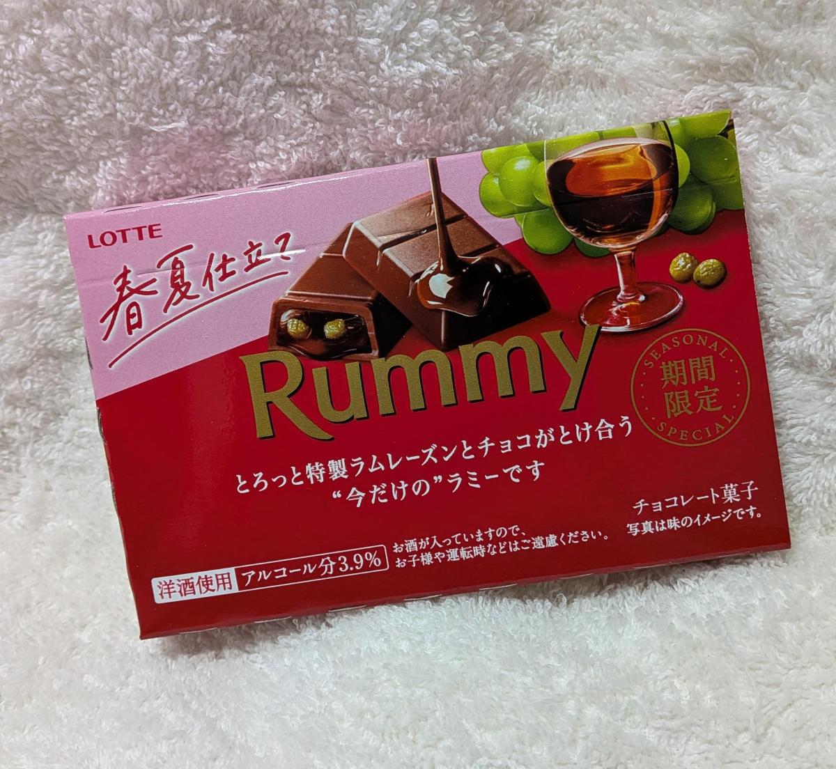 ラミー 春夏仕立て味が気になり購入してみました。1つが結構な大きさで3つに小分けされていました。外側パリッと、柔らかい口溶け滑らかな生チョコにラムレーズン入りで、レーズンはしっかりと粒感があります。ほんのり香る洋酒が美味しさとミルクチョコレートほど甘くなく、絶妙な甘さとカカオの渋みもあって大人な味わいで美味しかったです。