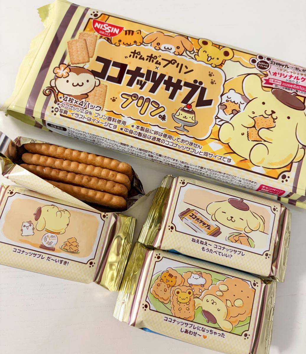 ポムポムプリンとのコラボパッケージが可愛らしい、新商品のプリン味のココナッツサブレです。開封するとほのかにプリンの風味がしてサブレもまさにプリンの味わいでした。さっくりして表面のザラメもあります。割と甘いなと感じましたが、とても美味しかったです。