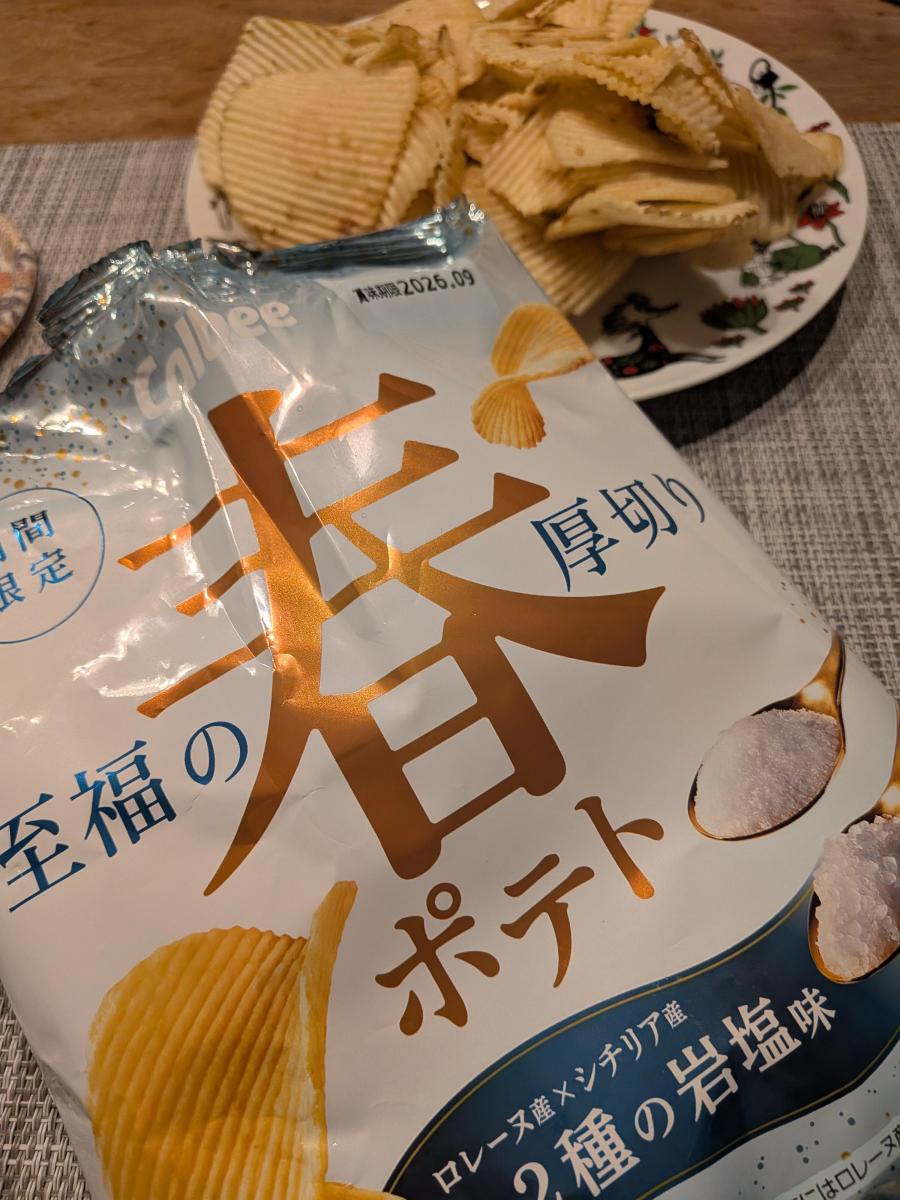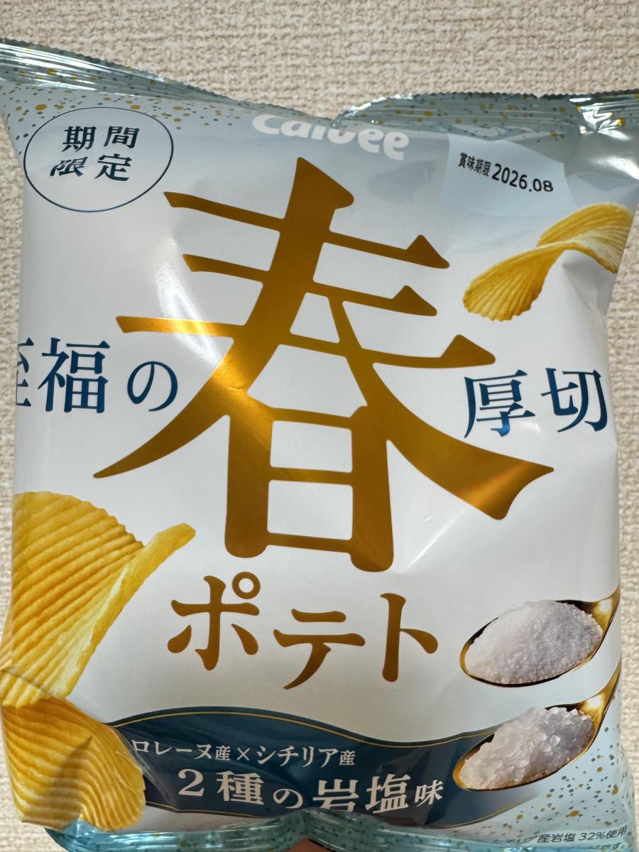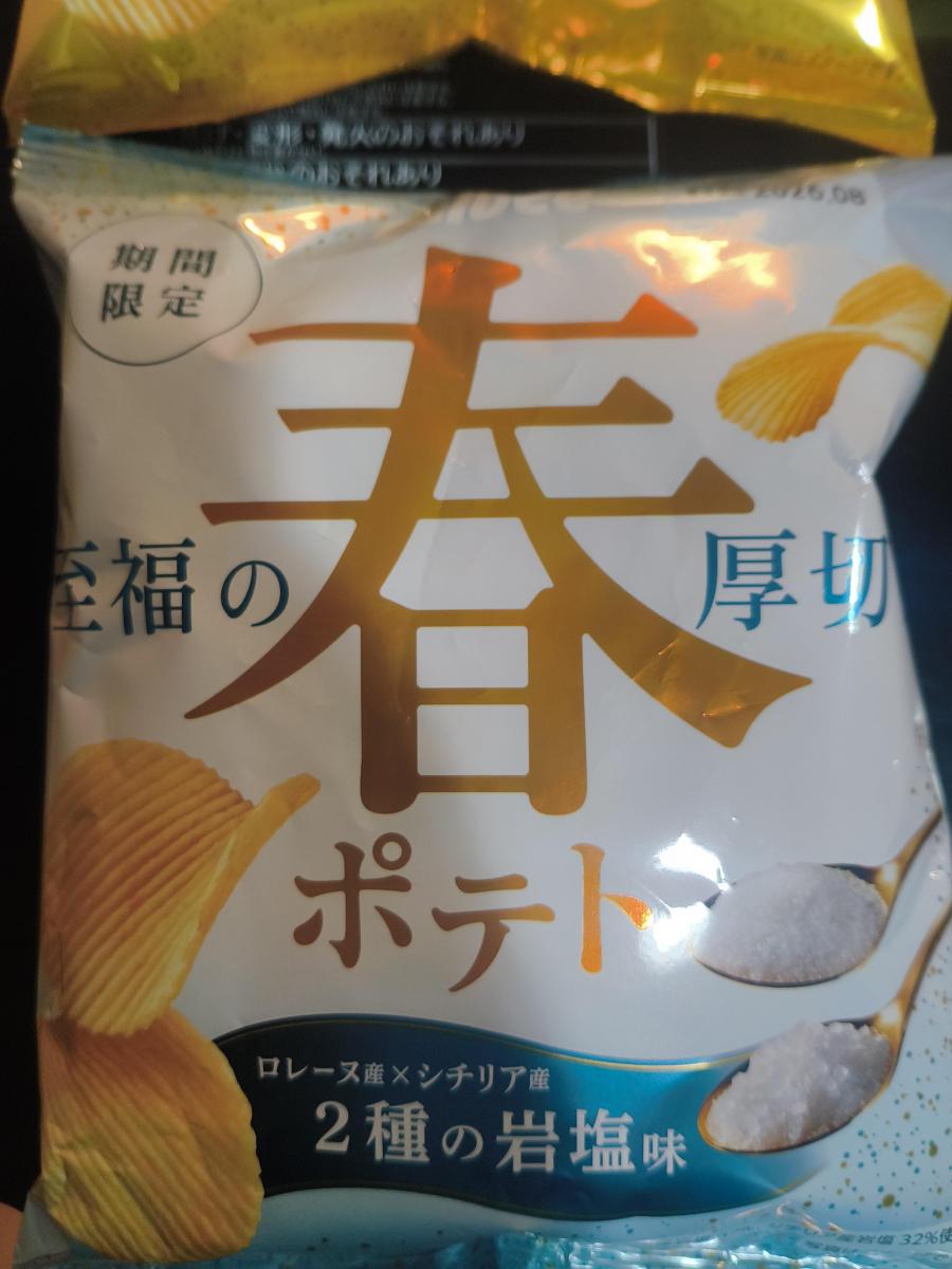 カルビー至福の春厚切りポテト2種の岩塩味は、厚切りならではのザクッとした食感と、岩塩のまろやかな塩味が絶妙に調和しています。じゃがいもの旨みがしっかり感じられ、シンプルながら飽きのこない美味しさです。