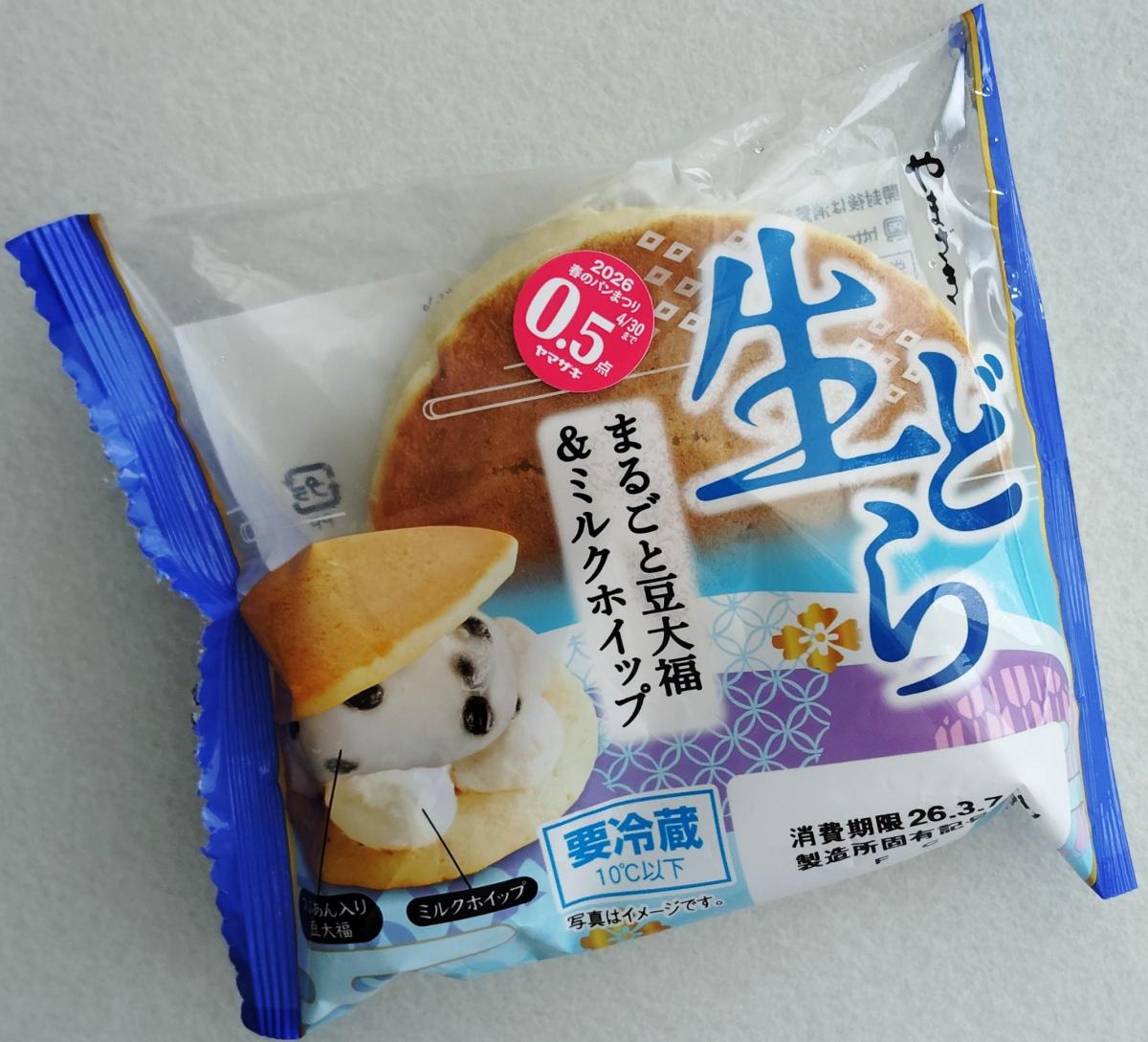 生どらのまるごと豆大福&ミルクホイップ味が気になり購入してみました。生地はふんわり、もっちりパンケーキのような食感です。ミルクホイップは、なめらかな口溶けで、やさしい甘さで、ミルキーで美味しいです。豆大福はもちもちで、赤えんどう豆がごろっとくっついていてホクホク食感があり、やさしい塩味を感じ大変美味しい味わいでした。