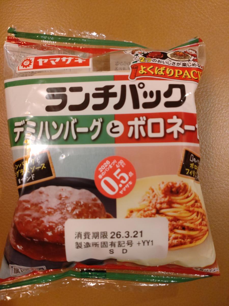 ランチパック デミハンバーグとボロネーゼ味が気になり購入してみました。リベイクしました。すると、ふんわりサクッと柔らかい食感になり大変いい食感になりました。食パンマークのパンにはボロネーゼフィリングがサンドされており、ミートの味わいが濃厚でした。もう一方のパンにはハンバーグとデミグラスソースがサンドされており、こしょうの辛みとデミソースの濃い味わいでした。