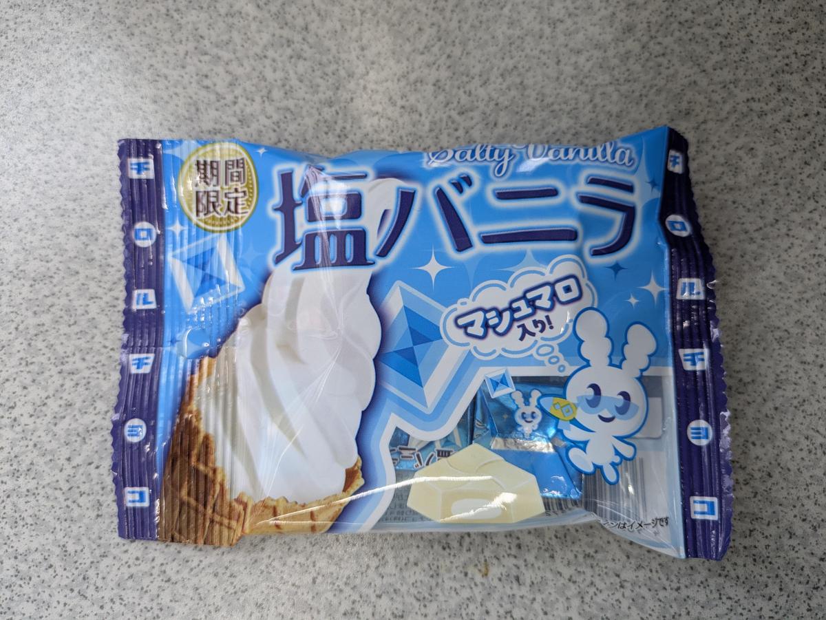 チロルチョコの塩バニラ味。涼しげで美味しそうだと思い購入。袋と個包装に描かれているうさぎのキャラが可愛い。