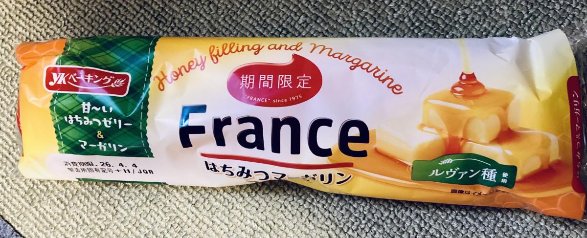 YKベーキングのフランスシリーズも定番だけでなく期間限定の商品もあるから嬉しくなりますよね。今回ははちみつマーガリンを買ってみました。パン生地はこのシリーズ全般でいえるソフトなフランスパン、中は二層になって上が塩気のあるマーガリンで下には甘めのハチミツゼリーになってます。ちょっとマーガリンの存在感が大きいかなという感じ。甘すぎない分食べやすいですよ。
