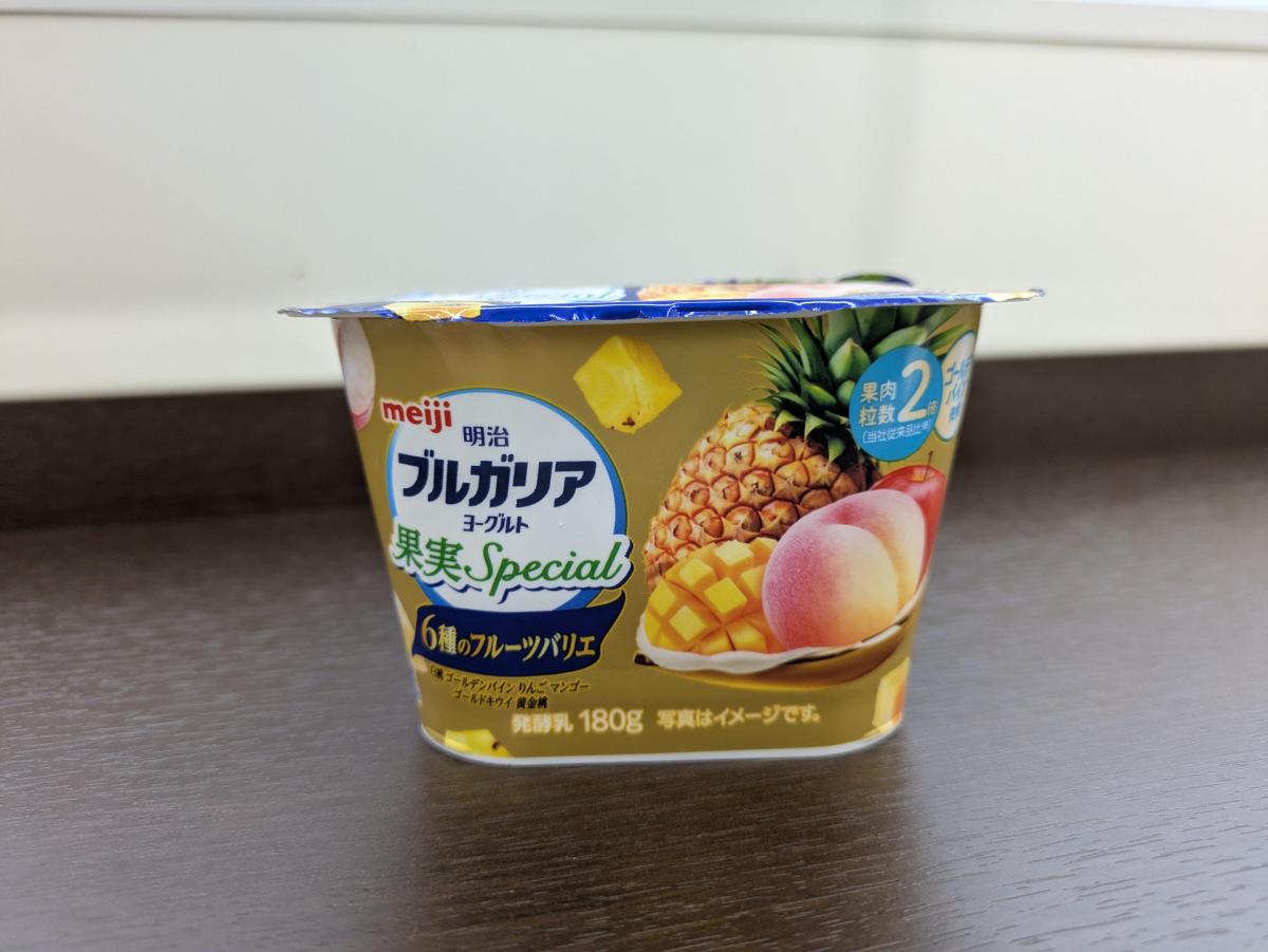 シャキっとしたパインにプルンとした桃の果肉がゴロゴロ入っていておいしい。味はパインと桃が先に来て、後からトロピカルなマンゴーとバナナが追いかけてくる感じ。りんごとマンゴ-の果肉やキウイ果汁も入っているみたいで、いろんなフルーツのおいしいとこどり。フルーツミックスのヨーグルトは他にもあるけど、ただ果汁が混ざっているというのではなく、かご盛りフルーツを楽しむような果実感がちゃんとある。