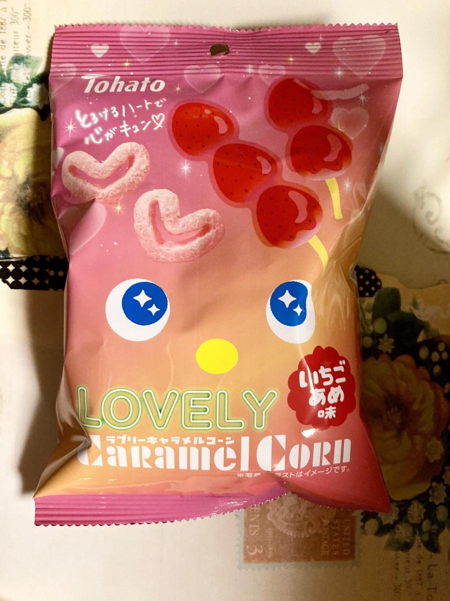 キャラメルコーン・いちごあめ味のパッケージがかわいくて気になり購入してみました。ハートの形のキャラメルコーンがとてもかわいいです。サクふわっと口に入れるととけるような食感もいつも通りですが、やや粉っぽさが感じられました。いちごあめのような甘酸っぱい甘さがたっぷりな味わいでした。