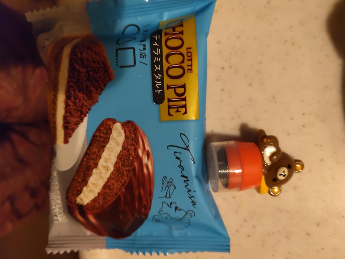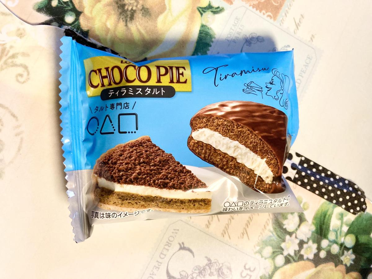 青いパッケージのチョコパイは、ティラミスタルトの味だそうです。