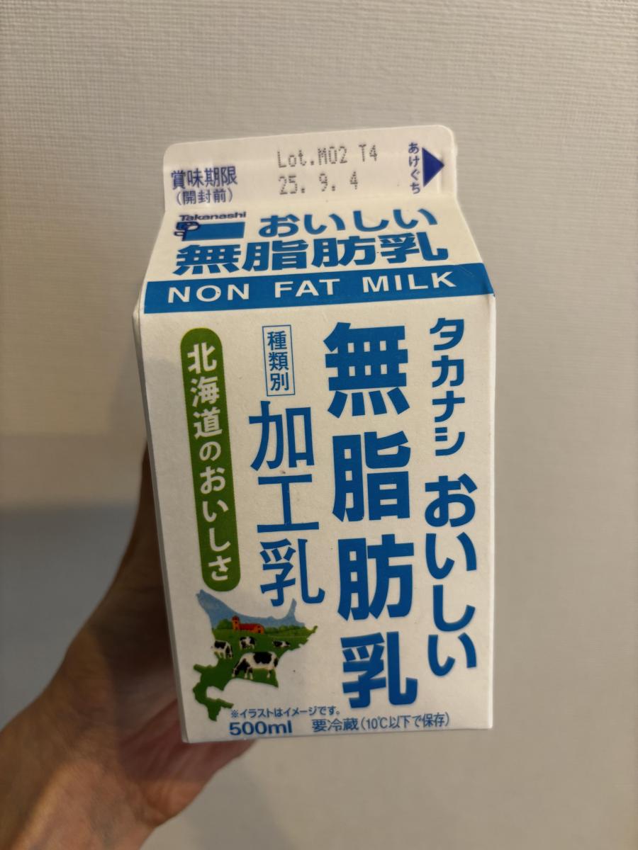 無脂肪乳(脂質0.2g)なので、成分無調整牛乳に比べるとさっぱりとした味わいに感じます。運動後にプロテインを混ぜて飲んでいます。