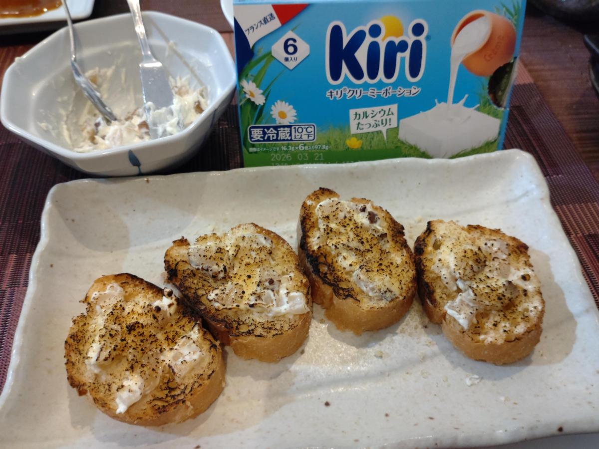 キリクリームポーションは、そのまま食べても美味しいですが、今回は、前から気になっていた、刻んだ、いぶりがっこと、クリームポーションを合わせてフランスパンの上に乗せて、おつまみを作ってみました。濃厚なクリームチーズあってのこの一品、何でもっと早く作らなかったのか後悔しました。レンジで柔らかくし、いぶりがっこを混ぜ合わせ、焼いたフランスパンの上に乗せ、ブラックペッパーを散らしてから、更にバーナーで炙ると、クリームポーションのコクが増し、いくつでも食べれてしまいます。クラッカーに乗せて食べても美味しく頂けました。